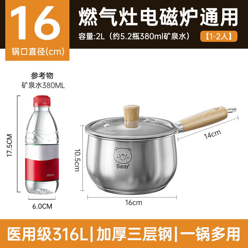 商品名称: 双枪316L不锈钢小奶锅辅食锅汤锅泡面蒸锅燃气电磁炉16cm带盖 DG10114/个