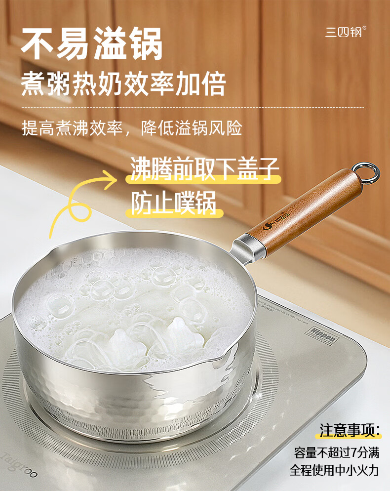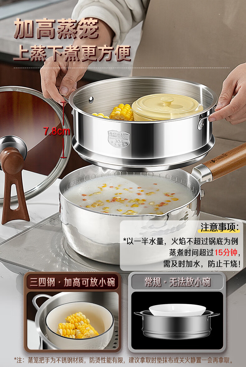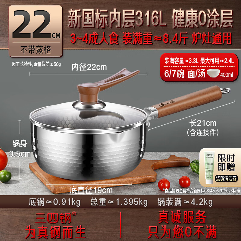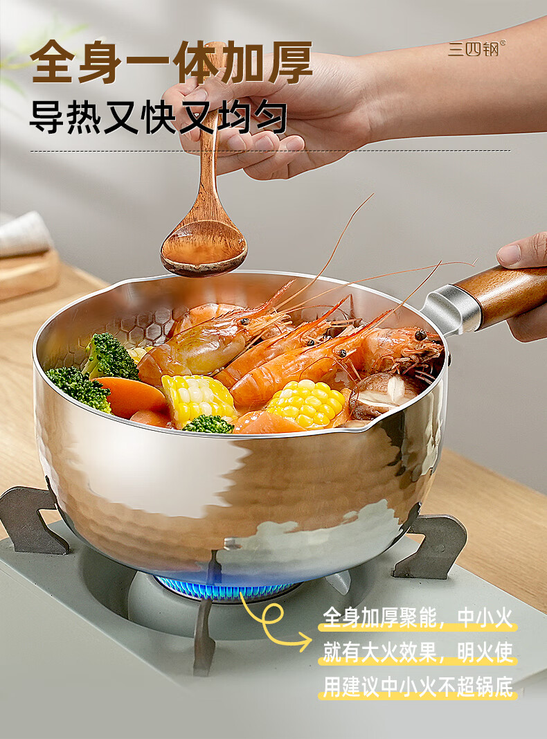 • 商品名称:三四钢雪平锅内层316L不锈钢奶锅22cm食品级煮面泡面小汤锅煮粥锅 38126 38126 御厨316L雪平锅:22cm/个