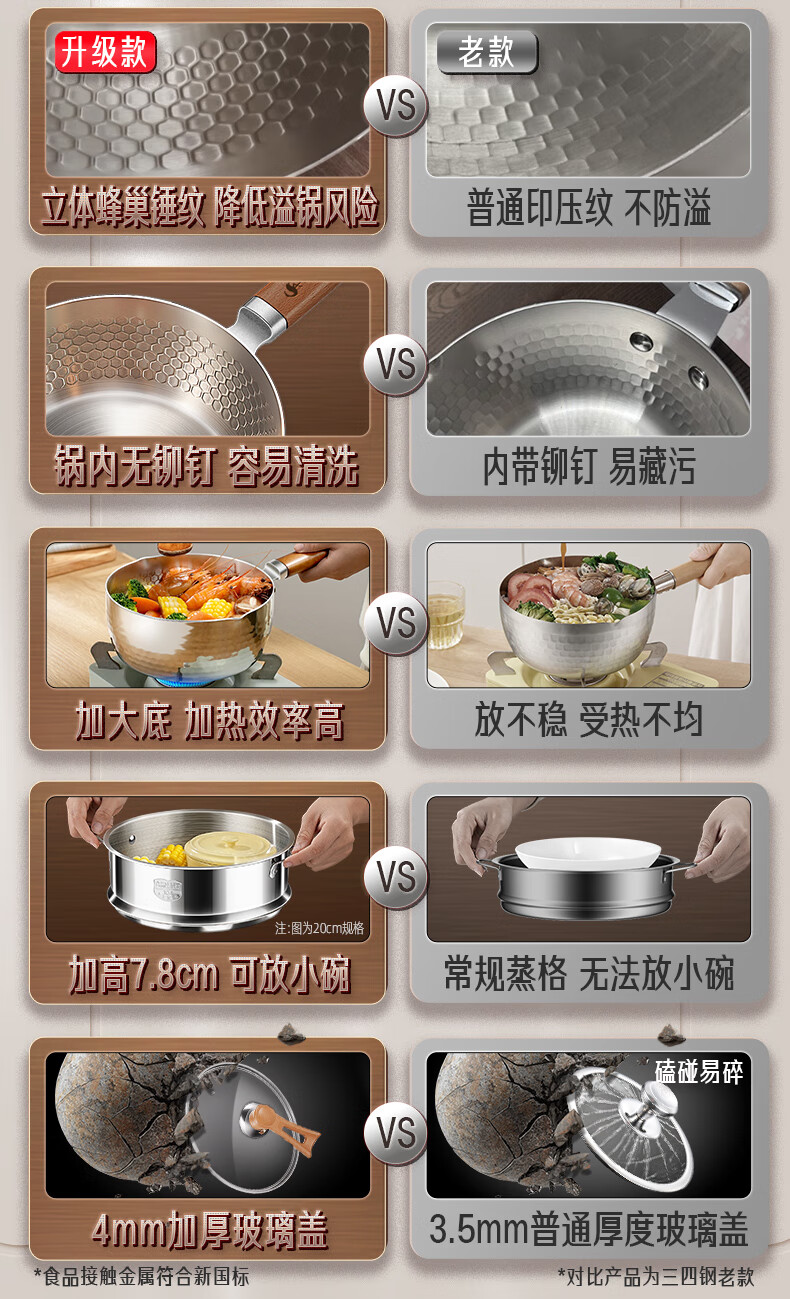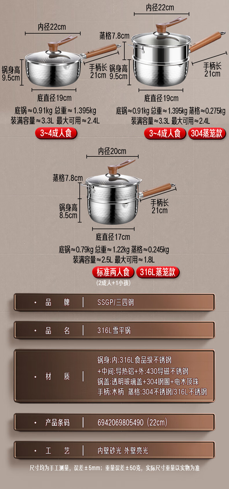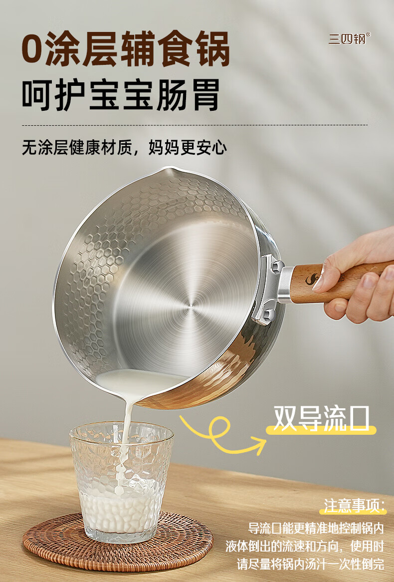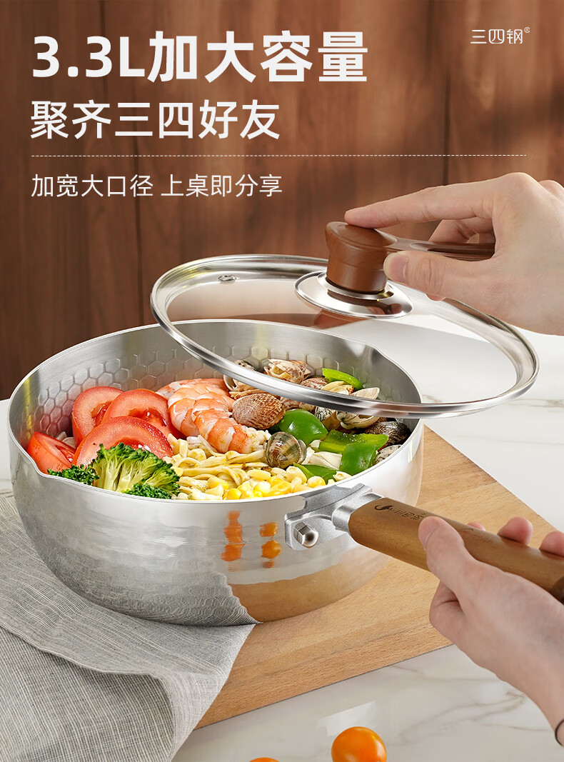 • 商品名称:三四钢雪平锅内层316L不锈钢奶锅22cm食品级煮面泡面小汤锅煮粥锅 38126 38126 御厨316L雪平锅:22cm/个