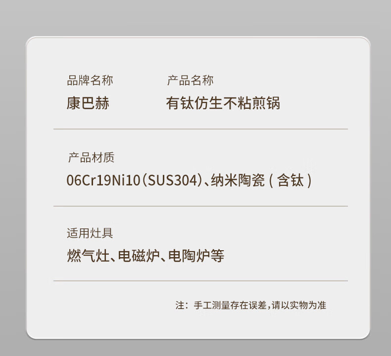 • 商品名称:康巴赫平底锅不粘锅有钛仿生煎锅不锈钢家用牛排煎蛋锅电磁炉通用26cm 仿生不粘煎锅/个