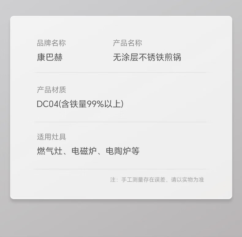 • 商品名称:康巴赫平底锅不粘锅煎锅无涂层铁锅免开锅煎蛋锅牛排煎锅早餐锅28CM KGL-J28T/个