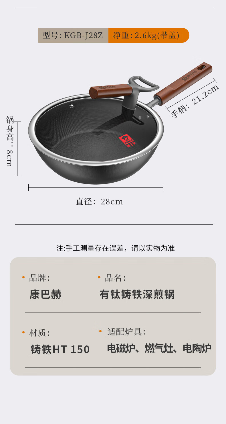 商品名称: 康巴赫平底锅有钛铸铁煎锅无涂层铁锅免开锅煎蛋锅牛排煎锅早餐锅26cm KGB-J26Z/个
