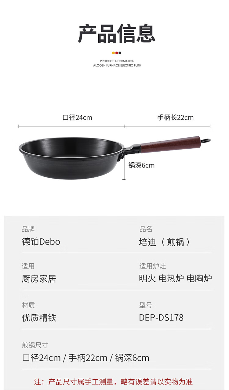 商品名称: Debo德铂煎锅无涂层锈不了煎炒铁锅培迪24cm DEP-DS178/个