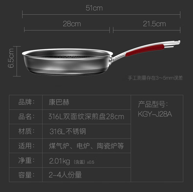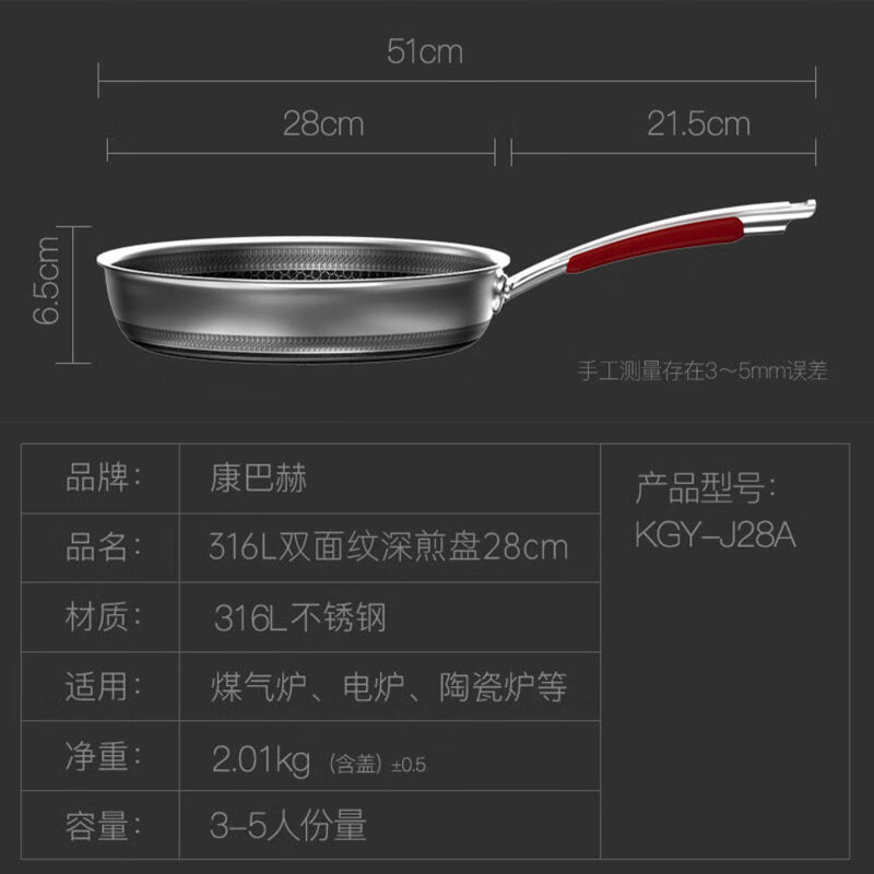 • 商品名称:康巴赫煎锅不粘锅平底锅316L不锈钢双面蜂窝煎28cm悦厨早餐锅燃气灶通用 KGY-J28A/个