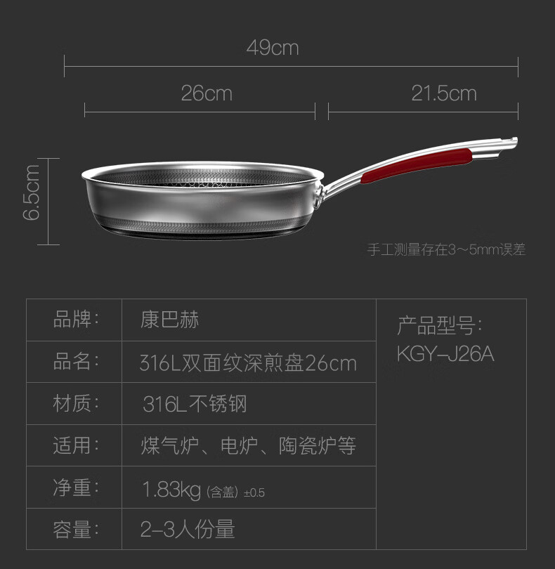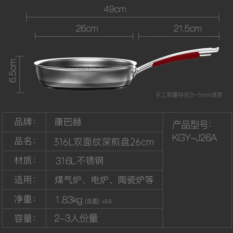 商品名称: 康巴赫煎锅316L不锈钢不粘平底锅升级双面蜂窝悦厨26cm电磁炉燃气通用 KGY-J26A/个