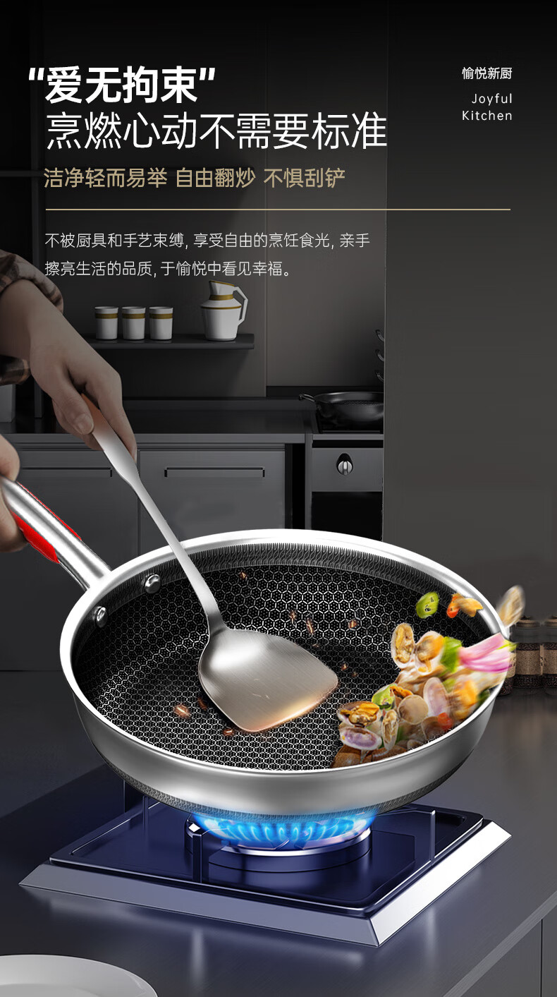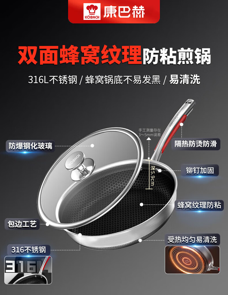 康巴赫煎锅316L不锈钢不粘平底锅升级双面蜂窝悦厨26cm电磁炉燃气通用 KGY-J26A/个