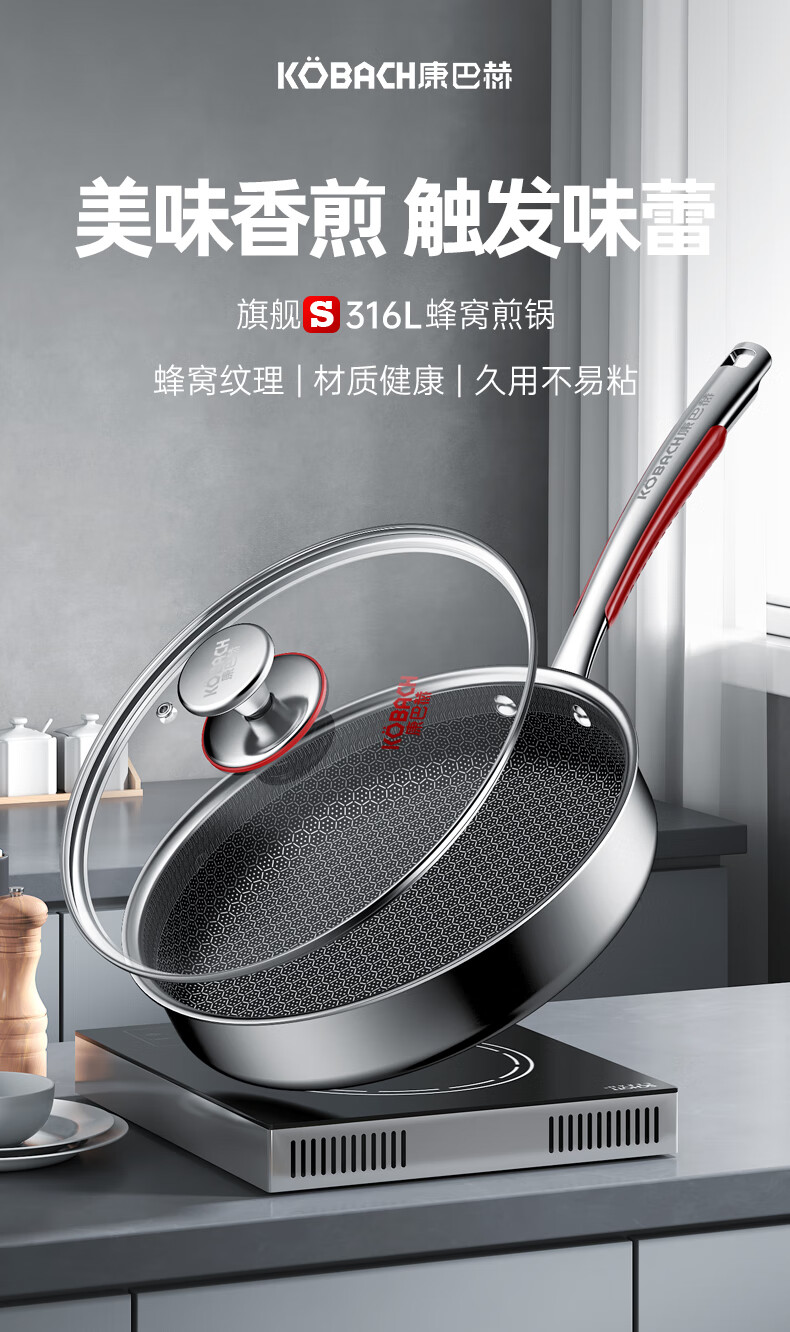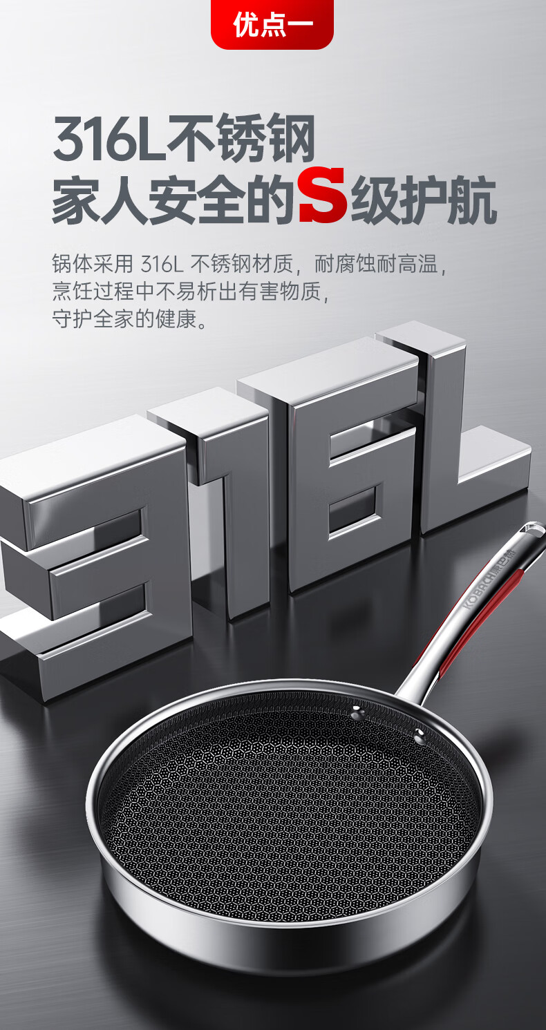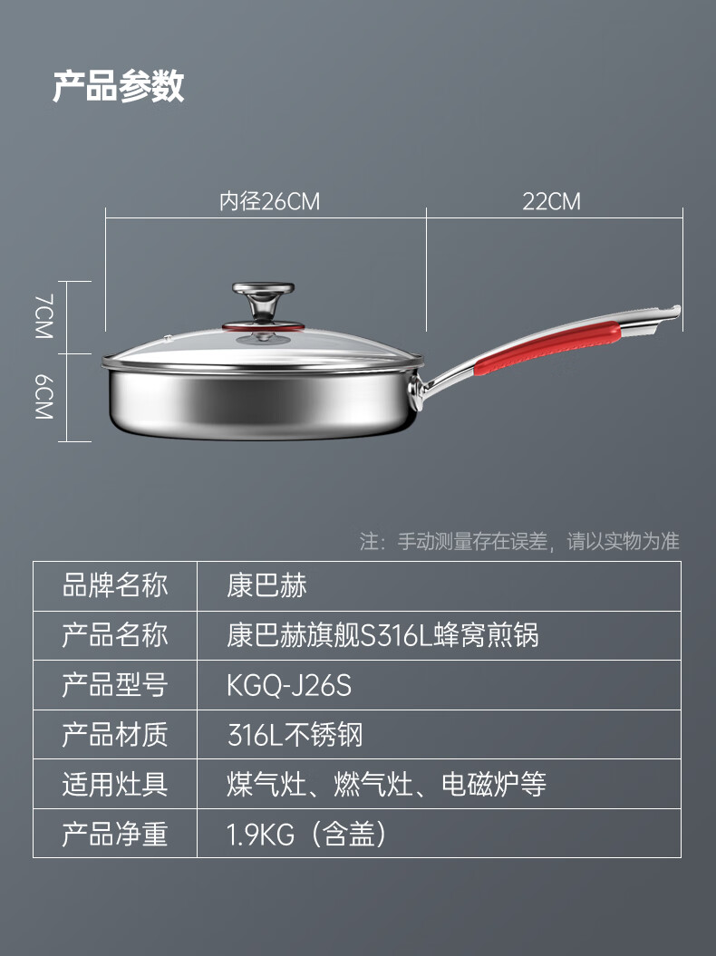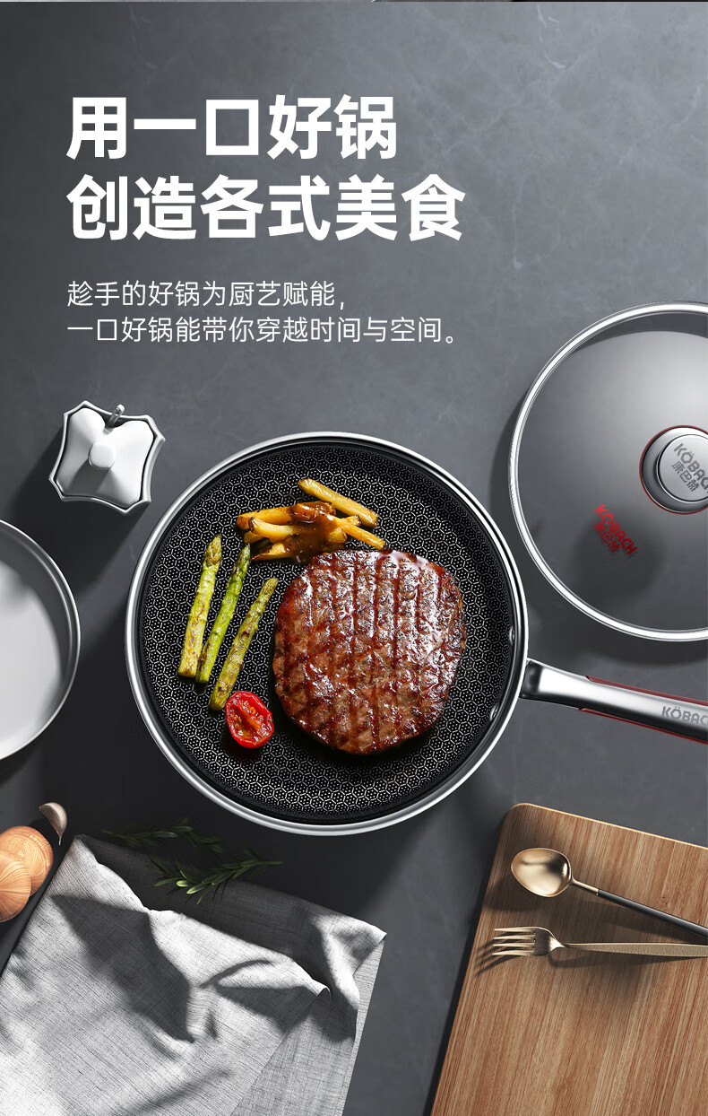 商品名称: 康巴赫旗舰S款316L不锈钢平底锅蜂窝家用煎牛排煎烙饼煎蛋不粘锅电磁炉 旗舰S煎锅/个