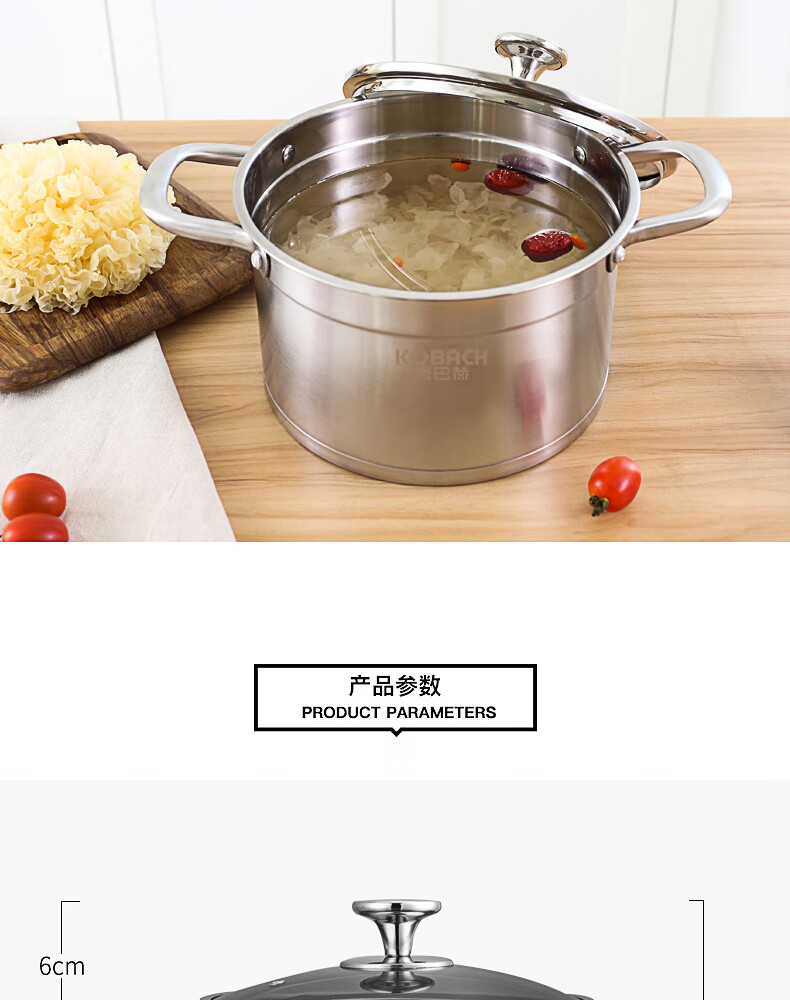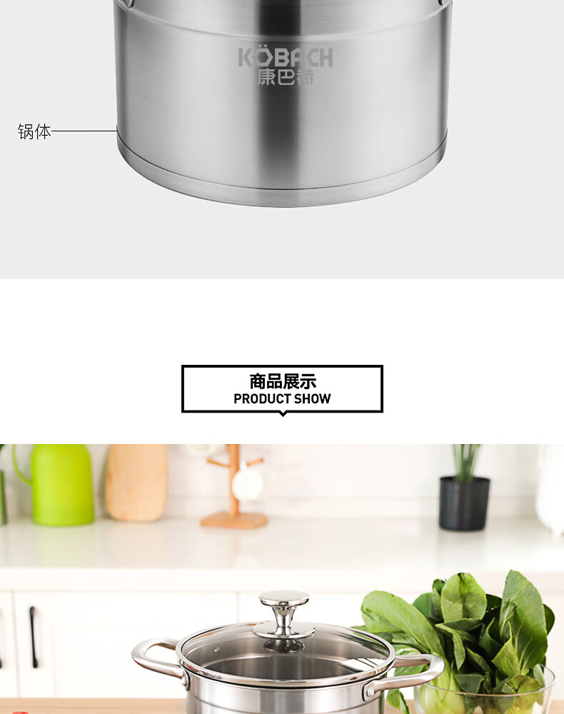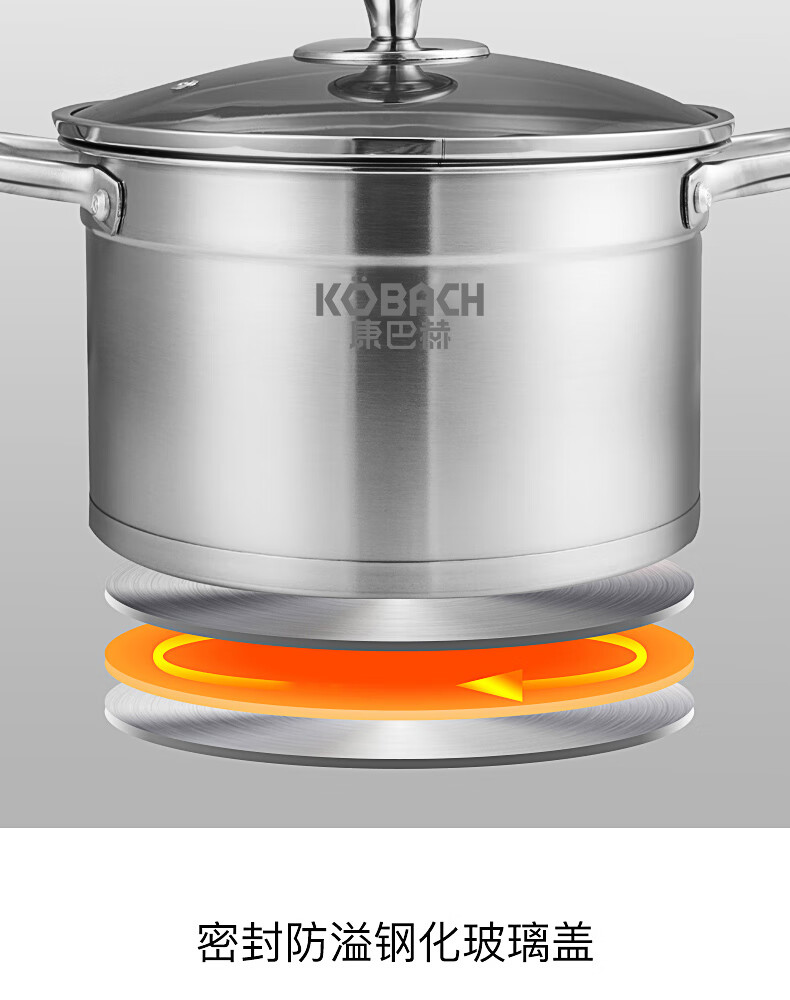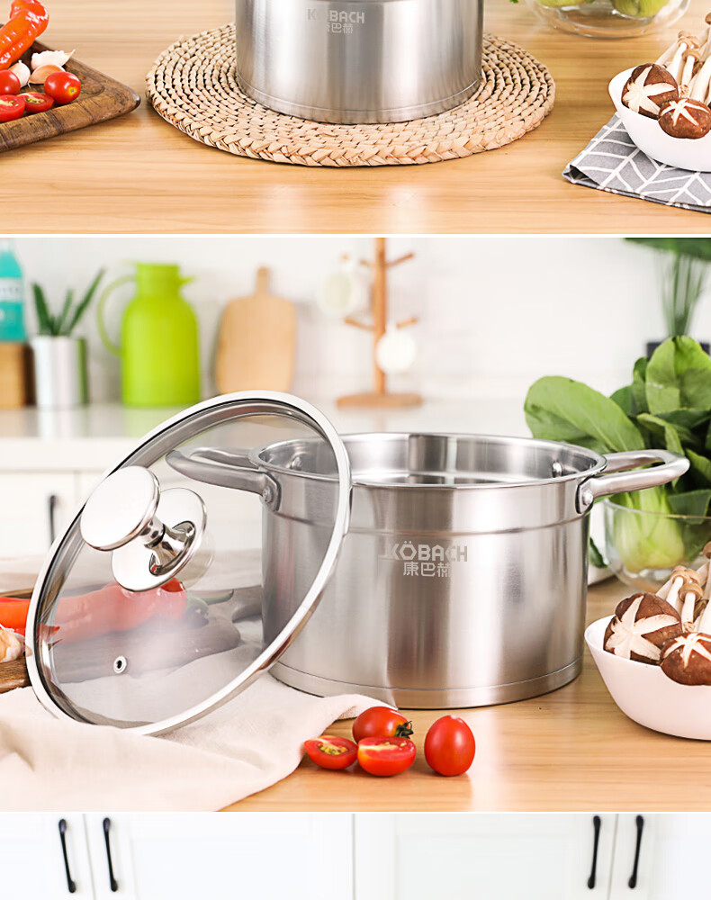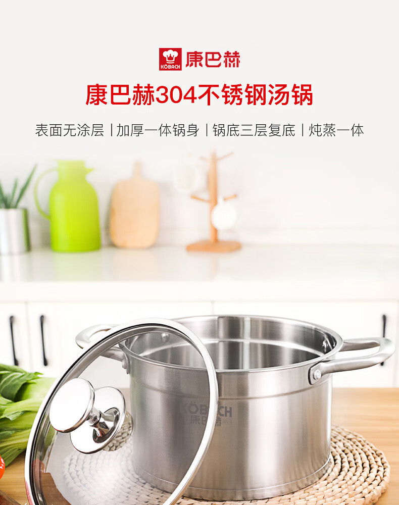 • 商品名称:康巴赫(KOBACH)汤锅304不锈钢22cm加厚复底双耳炖锅可视锅盖家用电磁炉燃气通用 【304不锈钢汤锅22cm】/个