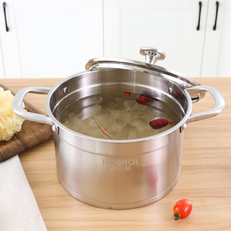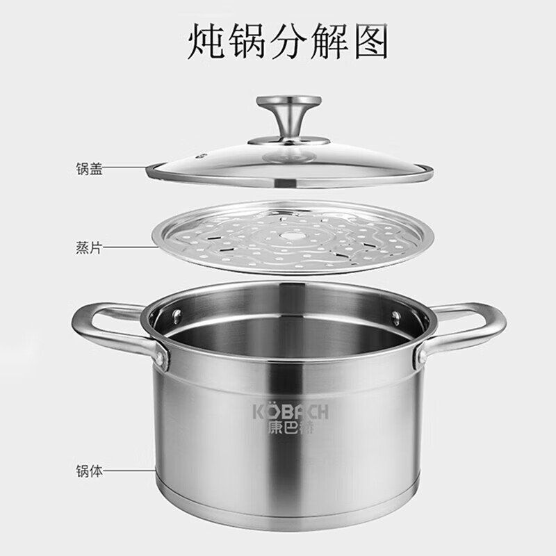 厨具  > 烹饪锅具  > 汤锅  >  康巴赫/KBH  >  康巴赫(KOBACH)汤锅304不锈钢22cm加厚复底双耳炖锅可视锅盖家用电磁炉燃气通用 【304不锈钢汤锅22cm】/个