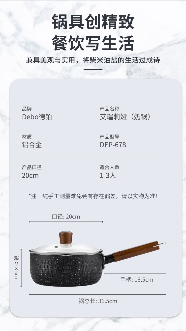 厨具  > 烹饪锅具  > 汤锅  >  德铂/Debo  >  德铂德铂奶锅不粘雪平锅辅食煮面小汤锅燃气电磁炉通用20cm DEP-678 DEP-678/个
