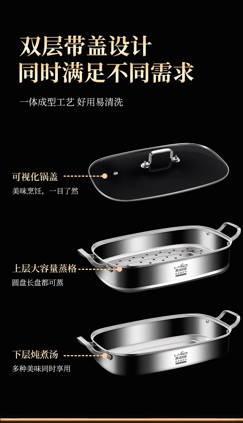 • 商品名称:莱柏顿316L不锈钢蒸鱼锅家用大蒸锅大号双层海鲜锅椭圆形蒸鱼蒸锅两层 316L椭圆形蒸鱼锅2层/只