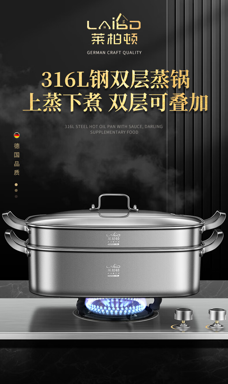 莱柏顿316L不锈钢蒸锅长方形大容量汤锅加深加厚海鲜锅椭圆形蒸鱼可定制 蒸锅单层【316L不锈钢】/个