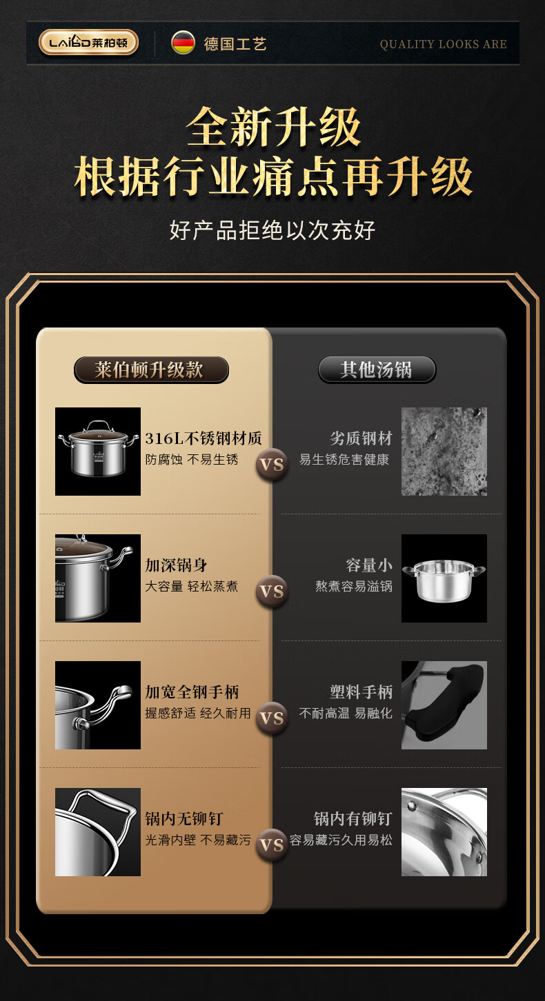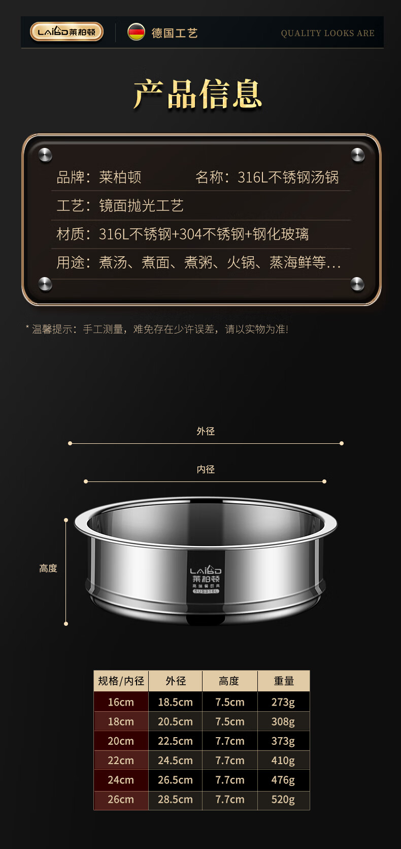商品名称: 莱柏顿316L不锈钢蒸锅双层加厚汤锅带蒸笼电磁炉炖煮锅煲汤锅22cm可定制 蒸锅22cm-红色/个