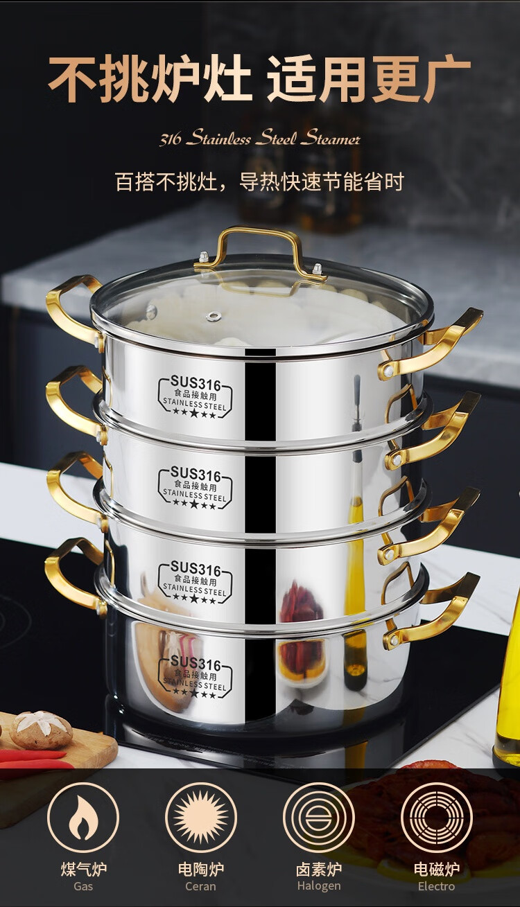 智星辉316不锈钢特厚复合多层钢蒸锅电磁炉通用炖锅蒸笼蒸锅二层32cm 特厚316蒸锅双层32cm/套