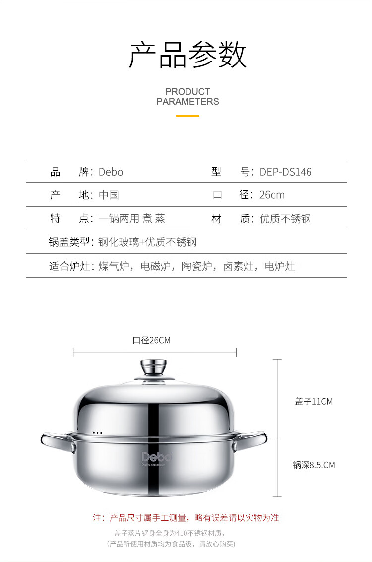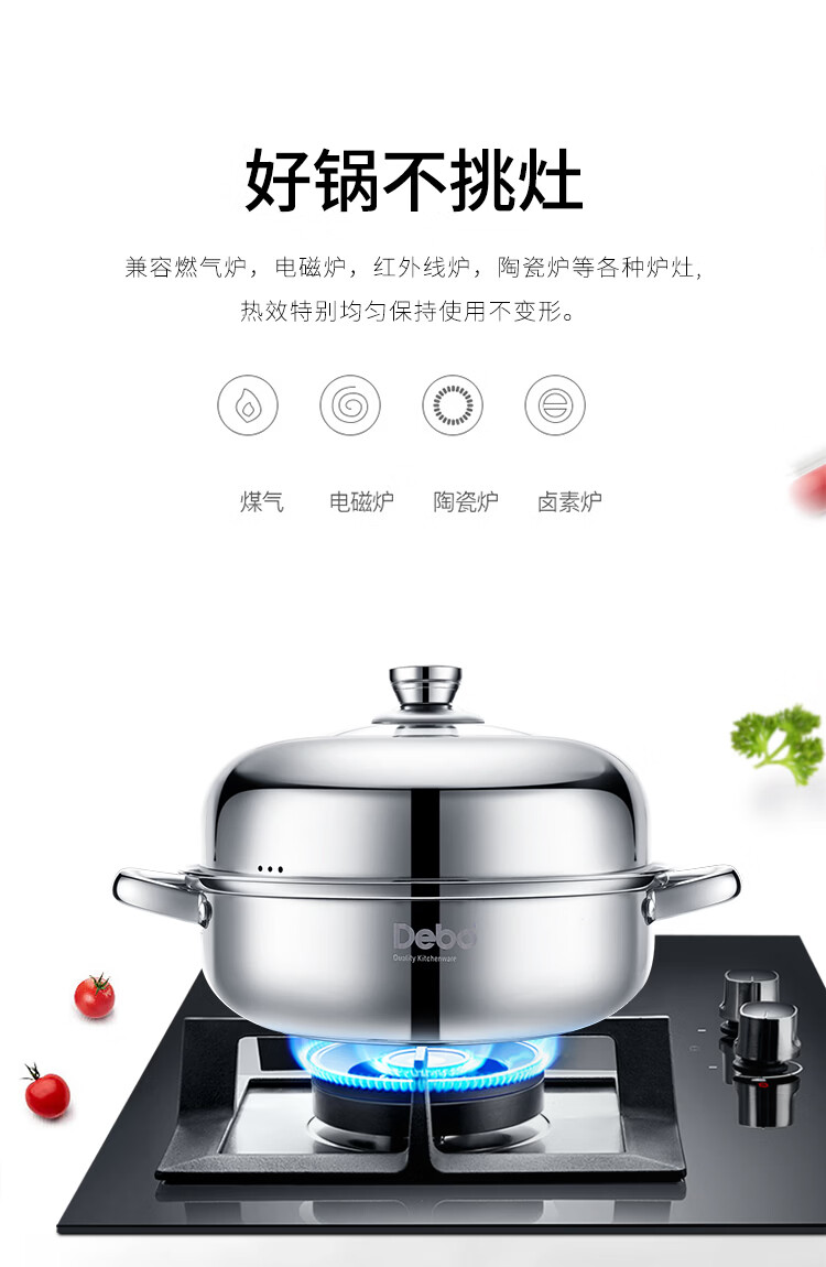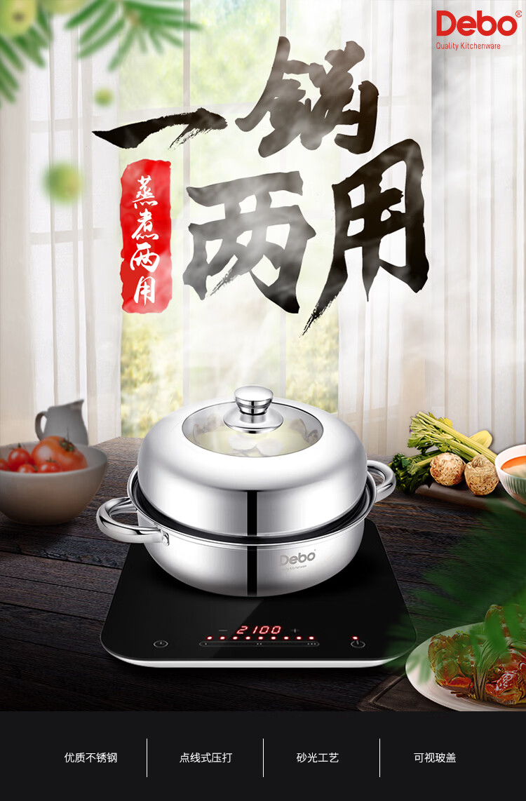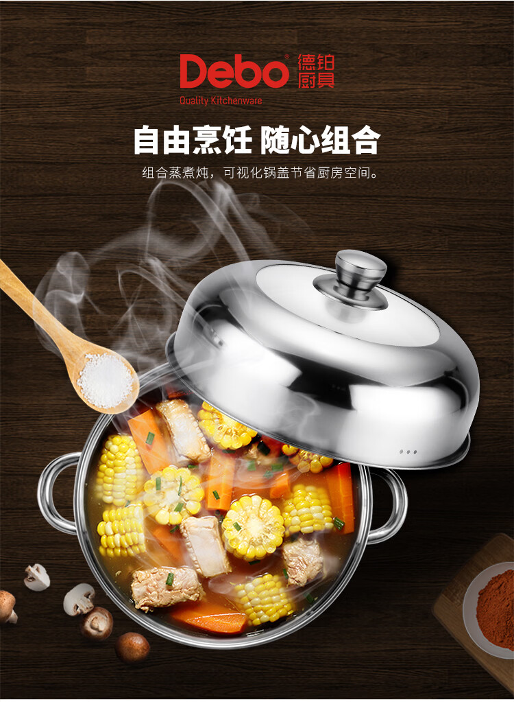 商品名称: Debo德铂汤锅不锈钢单层蒸锅蒸笼电磁炉两用锅艾琳诺26cm DEP-DS146/个