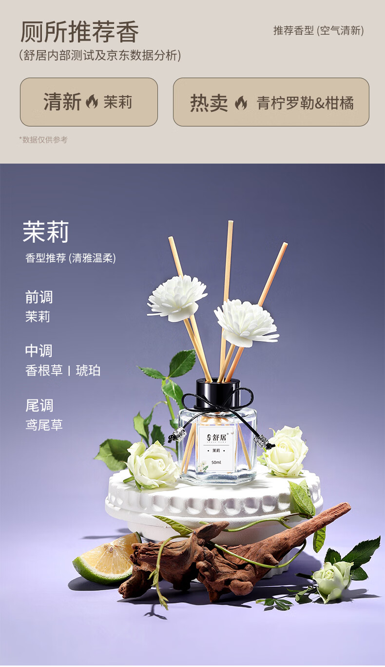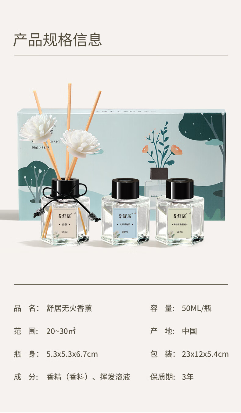 商品名称: 舒居无火香薰(三瓶装)室内卧室房间香氛香熏瓶厕所空气清新剂150ml 无火香熏A香水组/瓶
