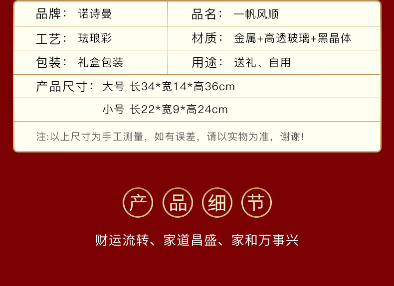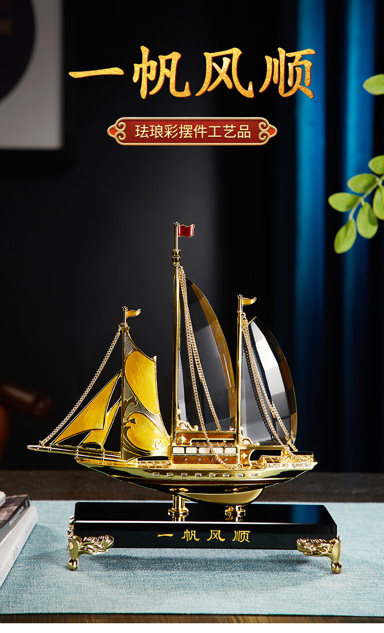 包装清单: 一帆风顺珐琅彩帆船小号摆件*1,礼盒*1,手提袋*1