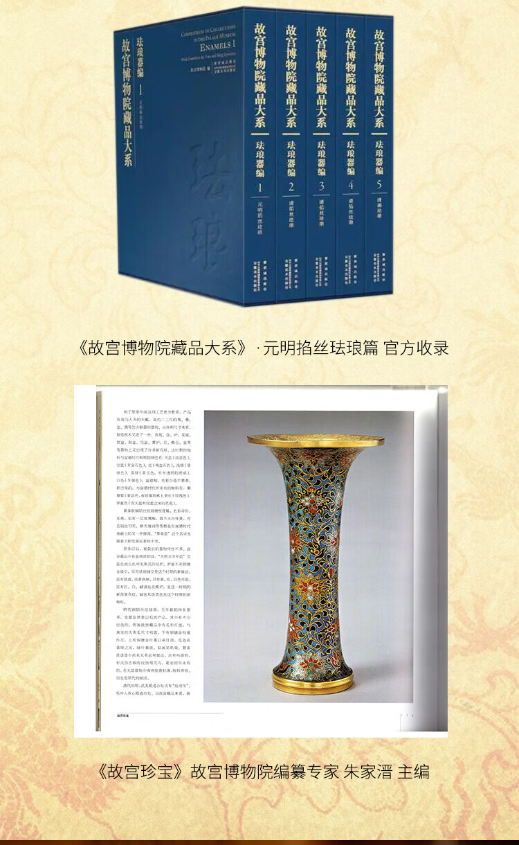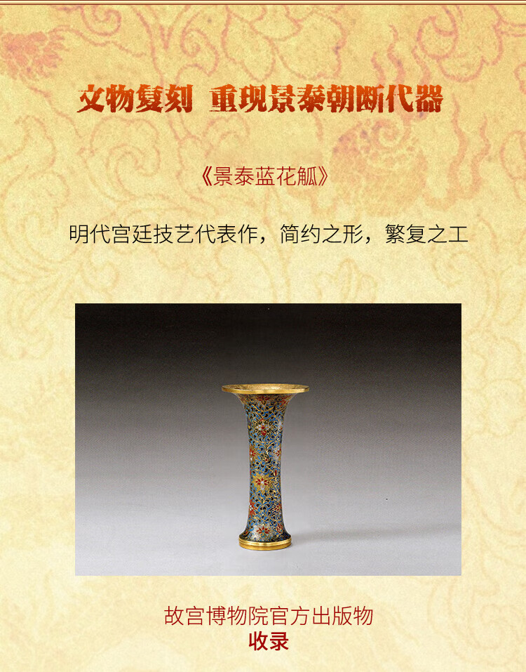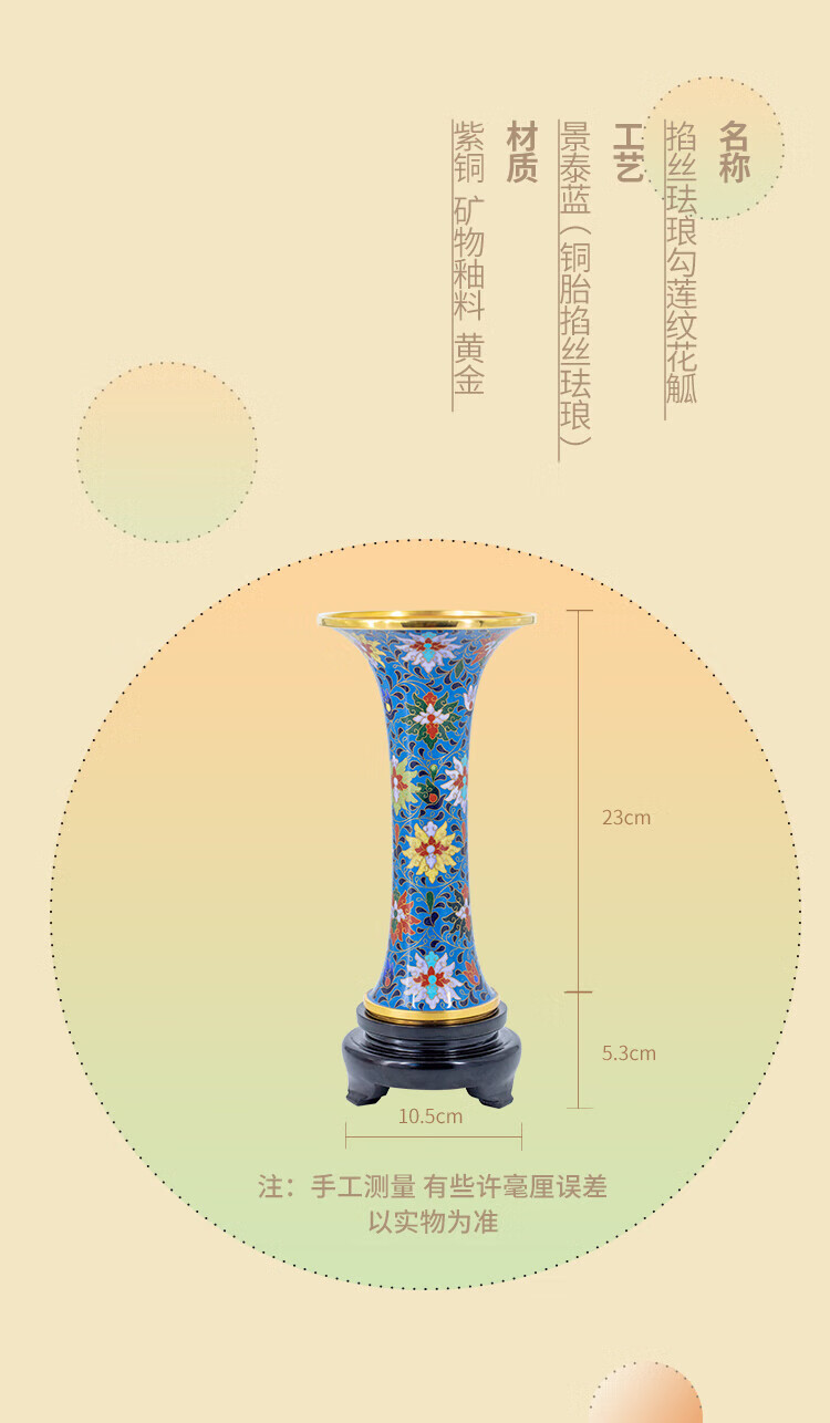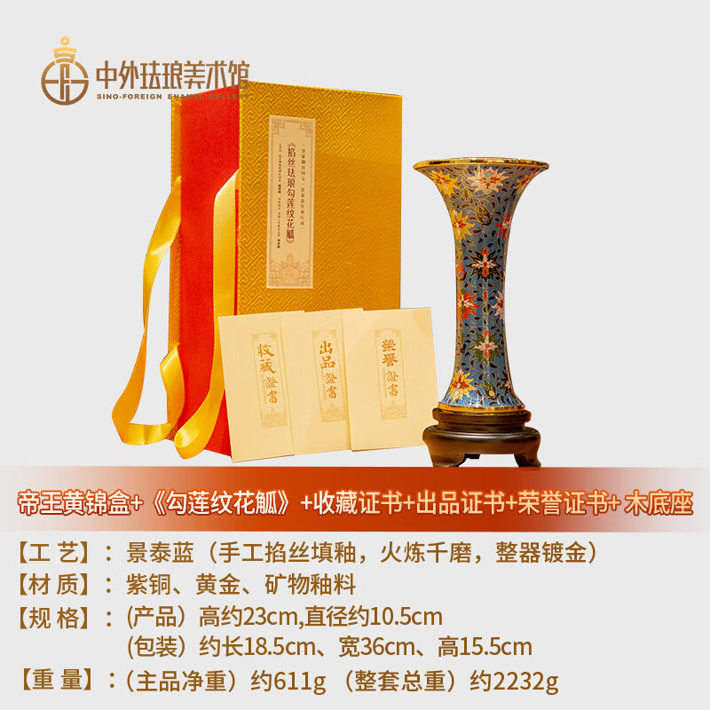 包装清单: 帝王黄锦盒x1、景泰蓝花觚x1、底座x1、收藏证书x1、出品证书x1、荣誉证书x1