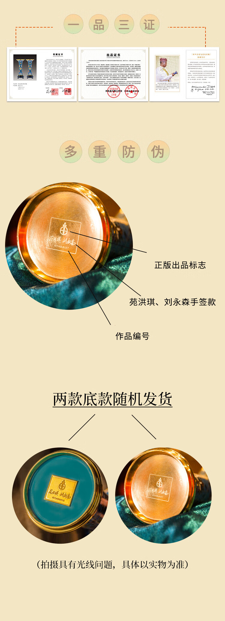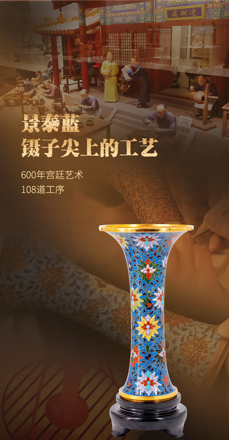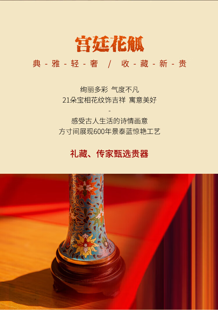 包装清单: 帝王黄锦盒x1、景泰蓝花觚x1、底座x1、收藏证书x1、出品证书x1、荣誉证书x1