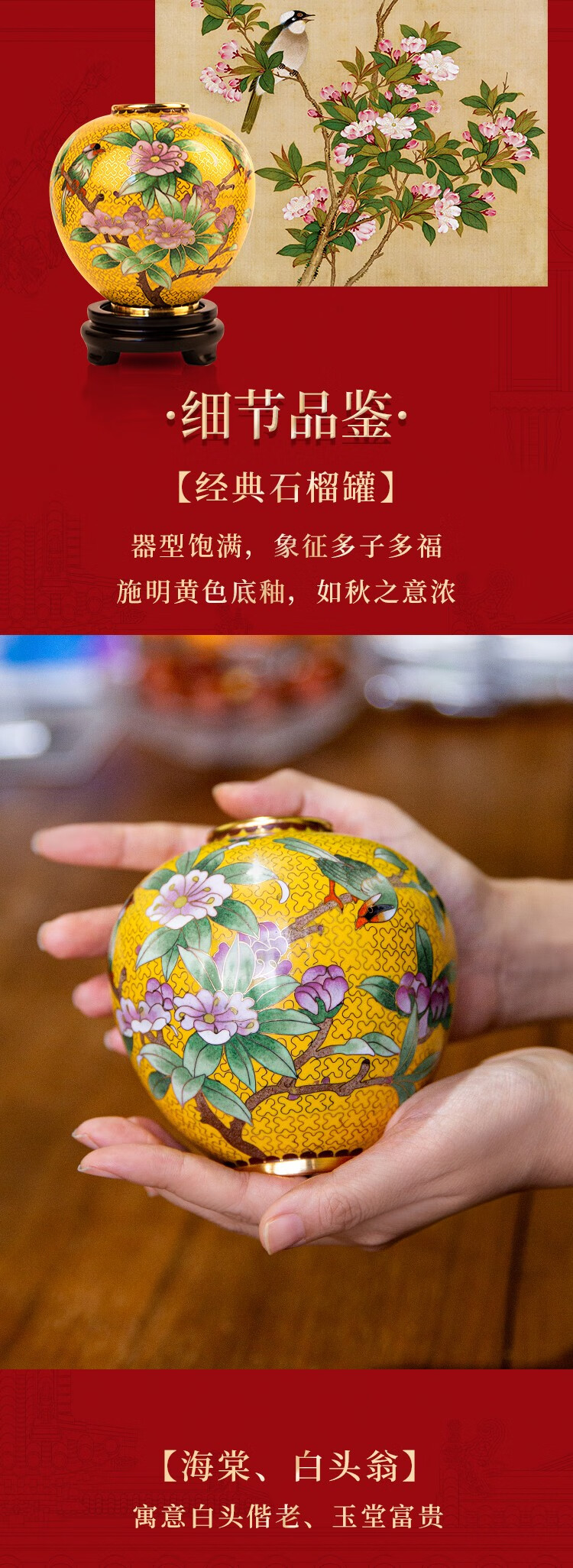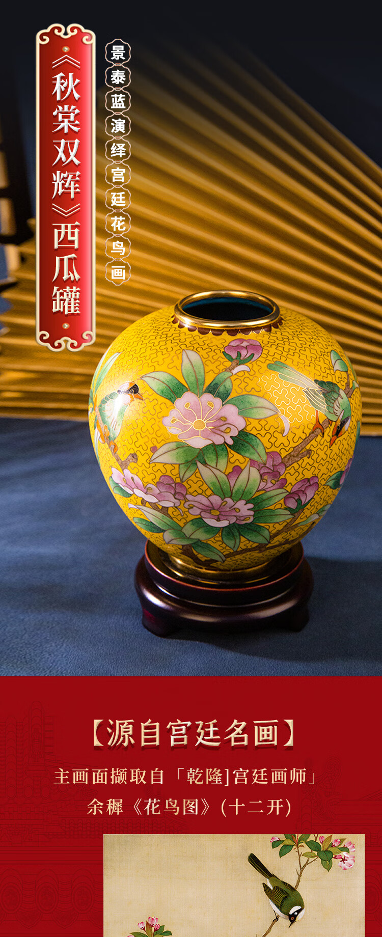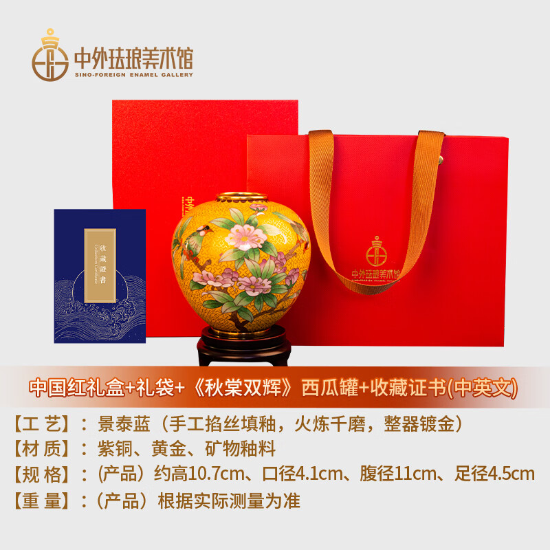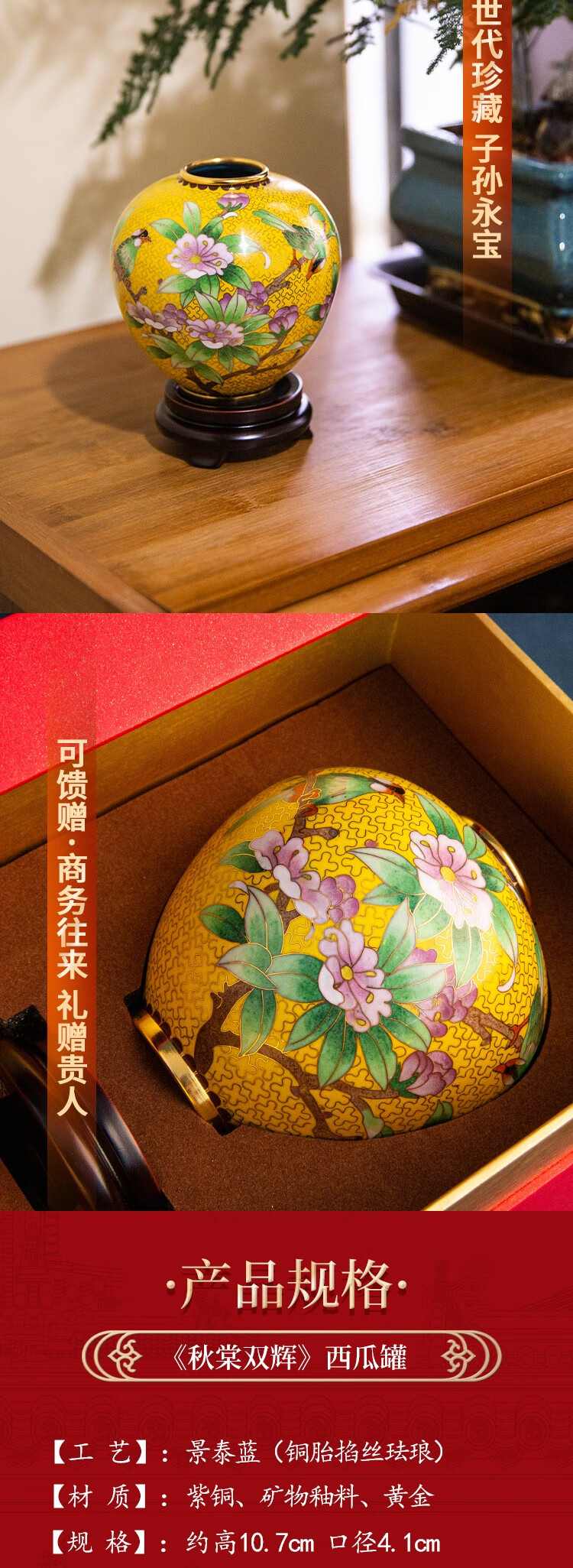• 商品名称:中外珐琅美术馆多子多福玉堂富贵 花瓶景泰蓝礼品生日礼物客厅书房办公室摆件 《秋棠双辉》西瓜罐/个
