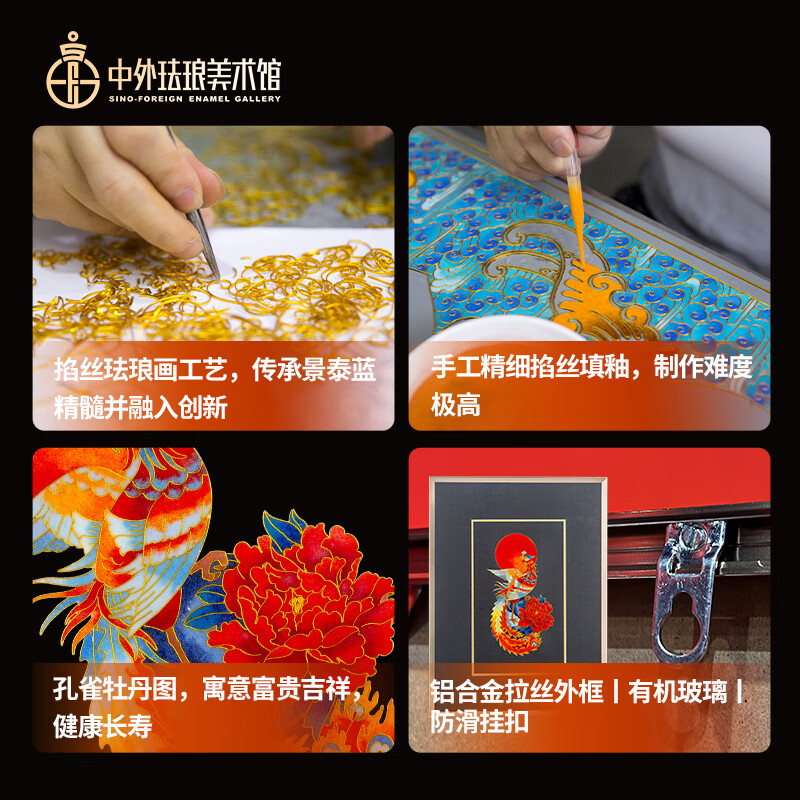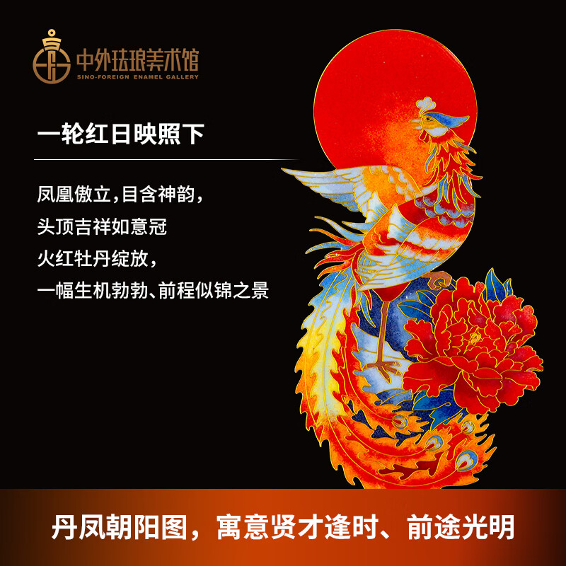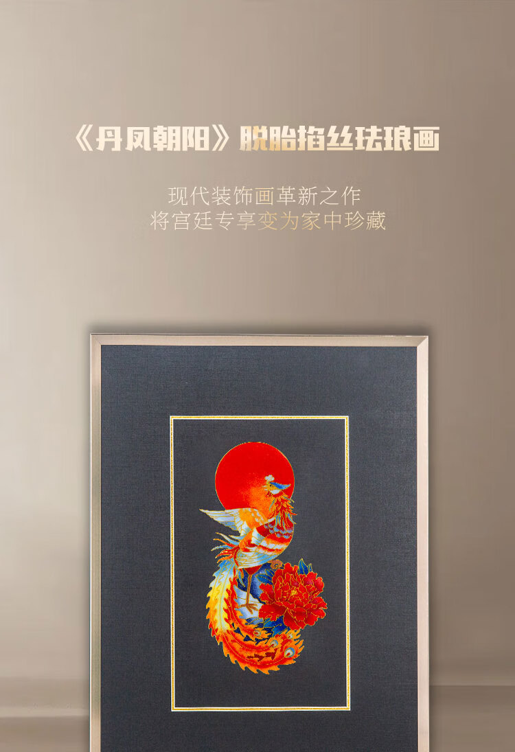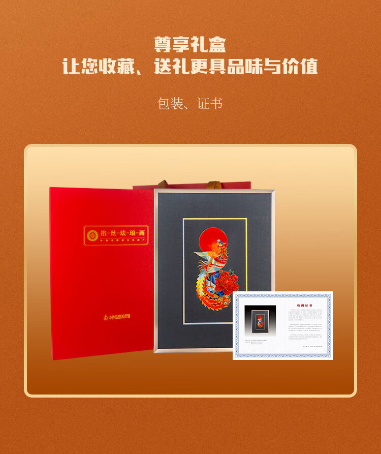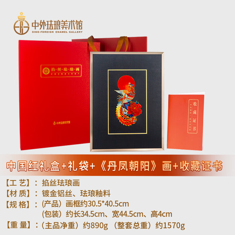 包装清单: 脱胎掐丝珐琅画《丹凤朝阳》*1、收藏证书*1、中国红礼盒包装*1、外包装箱*1