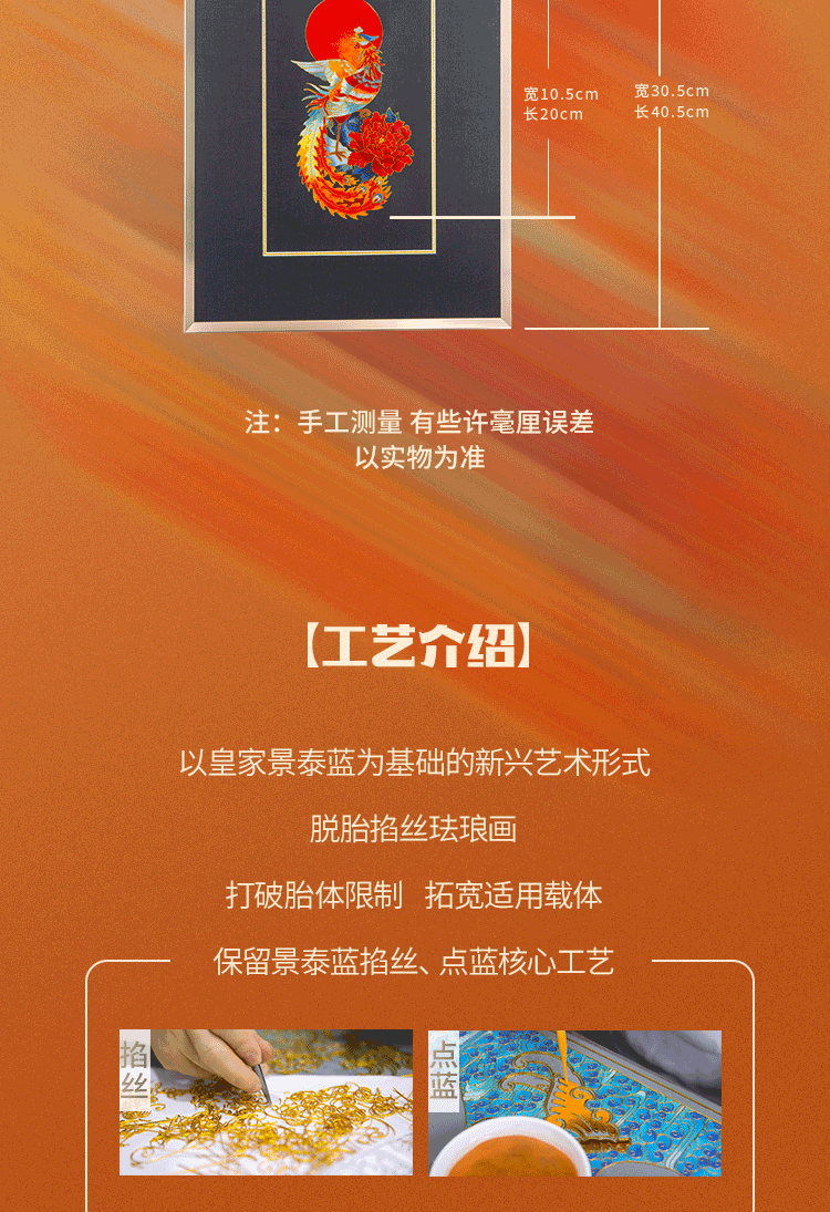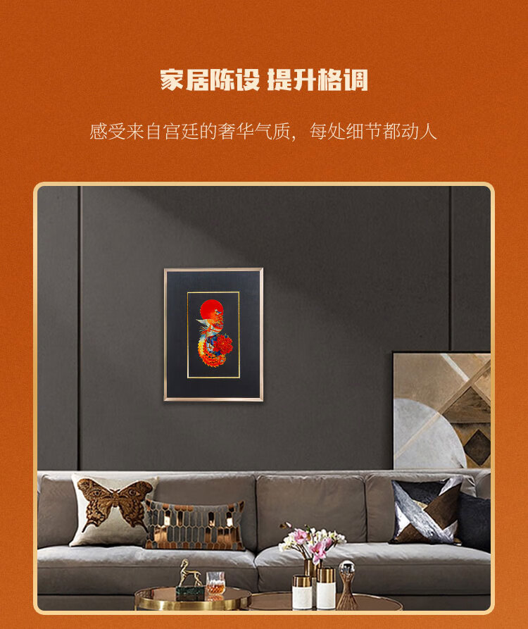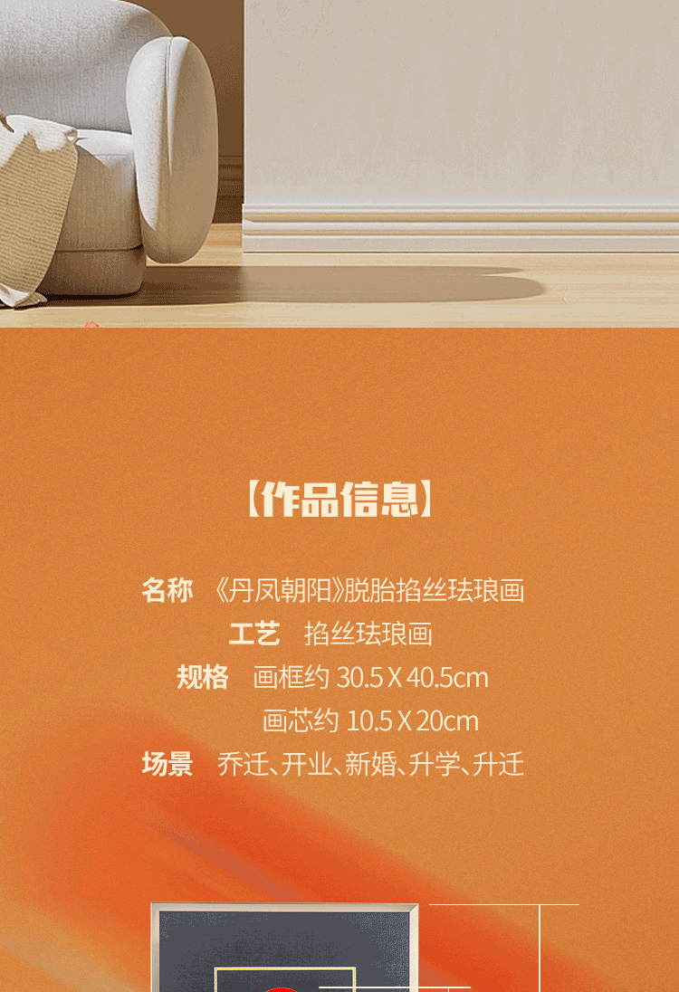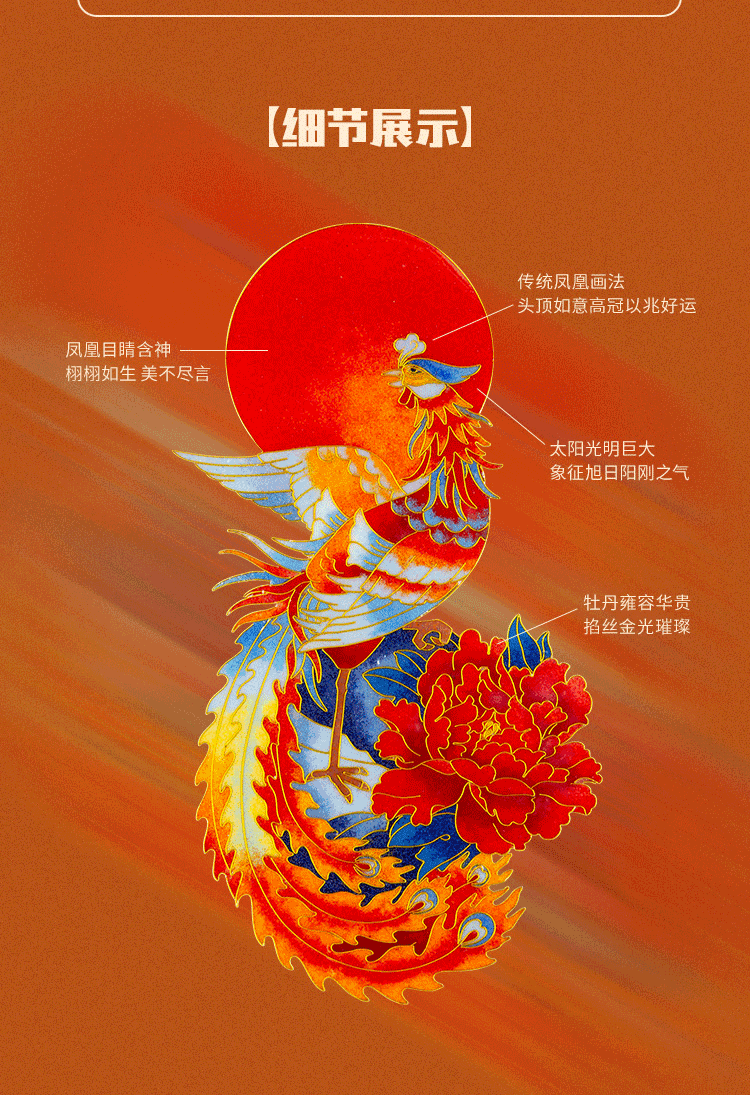 包装清单: 脱胎掐丝珐琅画《丹凤朝阳》*1、收藏证书*1、中国红礼盒包装*1、外包装箱*1