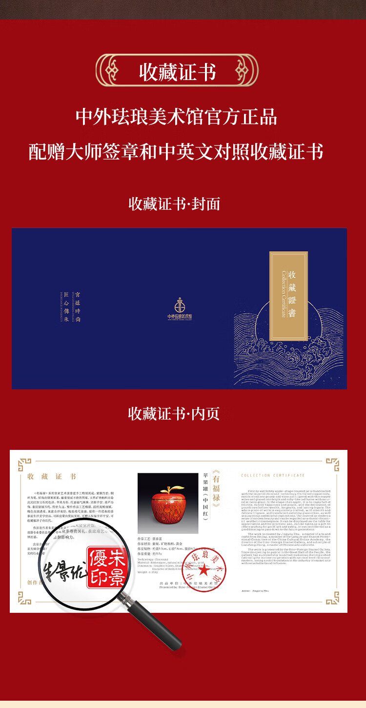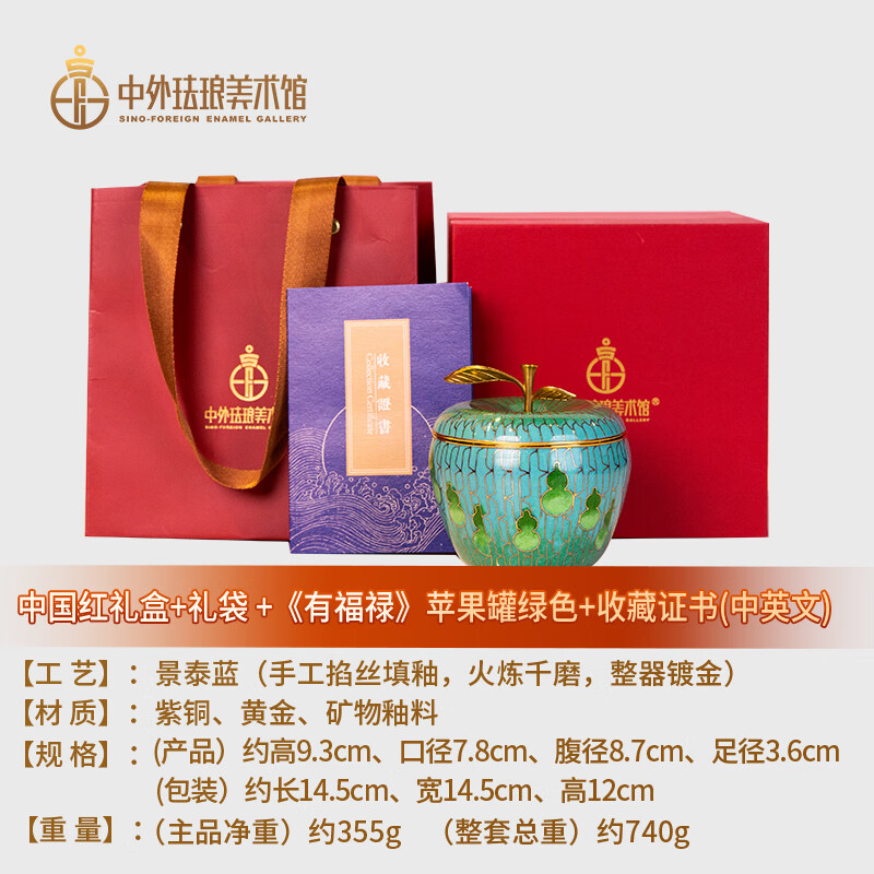 包装清单: 礼盒x1、《有福禄》掐丝珐琅苹果罐_红色x1、收藏证书x1