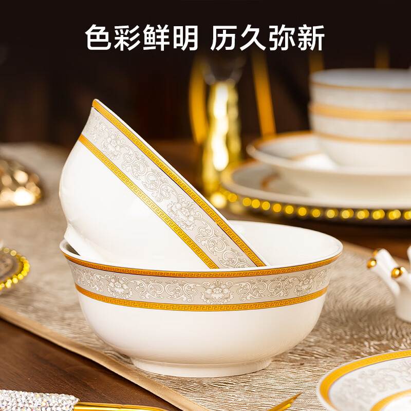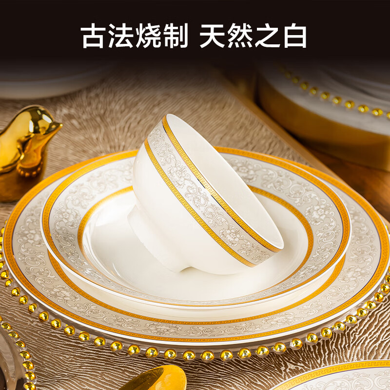 商品名称: 京东京造 碗盘餐具整套 碗具碟子套装乔迁之喜陶瓷礼盒 金玉满堂68头 金缕浮光68头/套