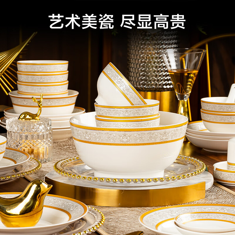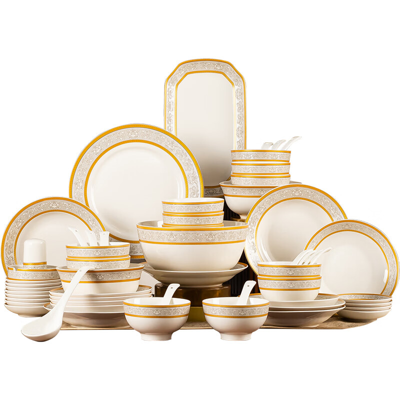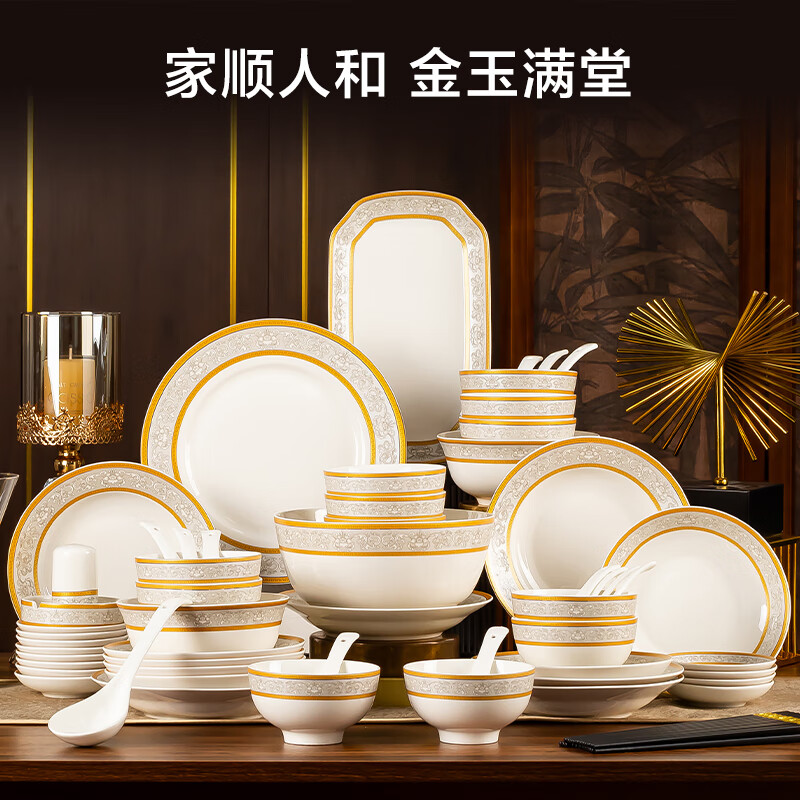 厨具  > 餐具  > 餐具套装  >  京东京造  >  京东京造 碗盘餐具整套 碗具碟子套装乔迁之喜陶瓷礼盒 金玉满堂68头 金缕浮光68头/套