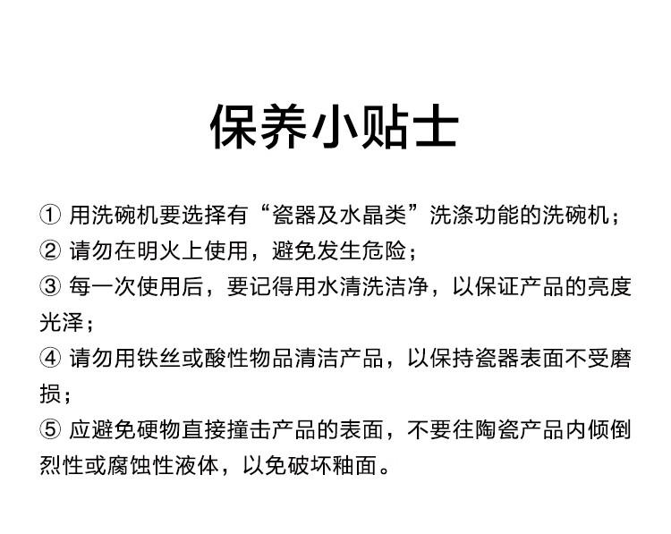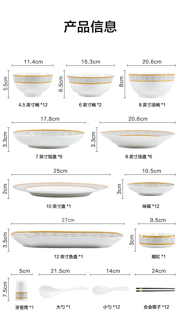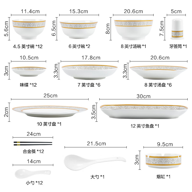 包装清单: 12个饭碗,12个小勺,12个味碟,12双筷子,6个8寸深盘,6个7寸深盘,2个面碗,1个8英寸汤碗,1个鱼盘,1个10寸大盘,1个大汤勺,1牙签筒,1个烟灰缸