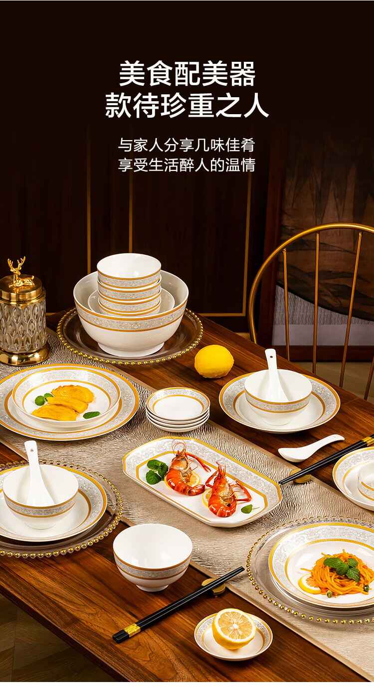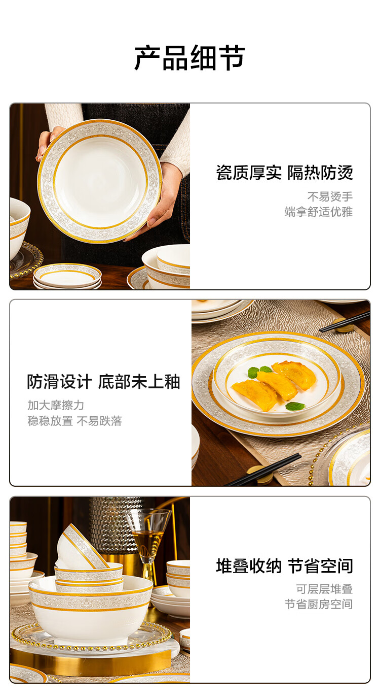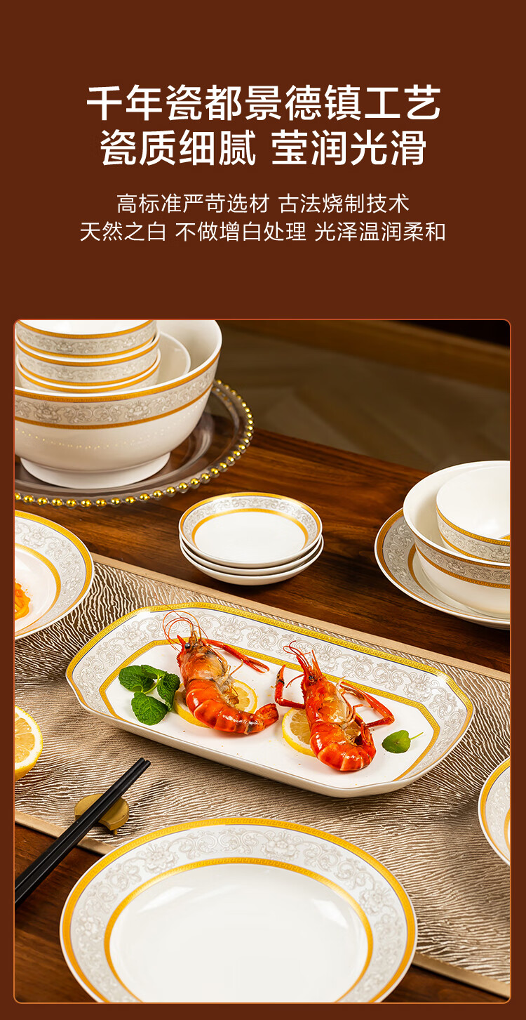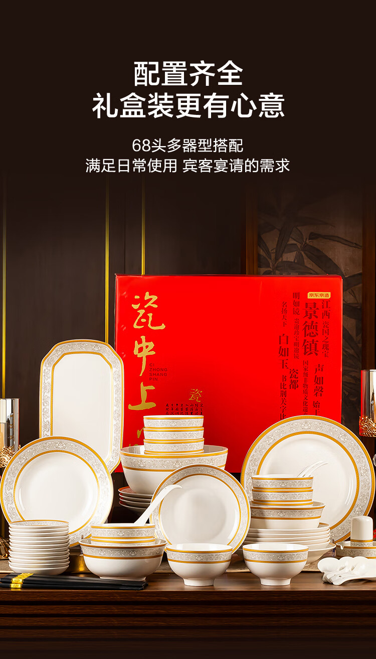• 商品名称:京东京造 碗盘餐具整套 碗具碟子套装乔迁之喜陶瓷礼盒 金玉满堂68头 金缕浮光68头/套