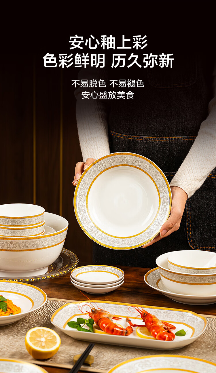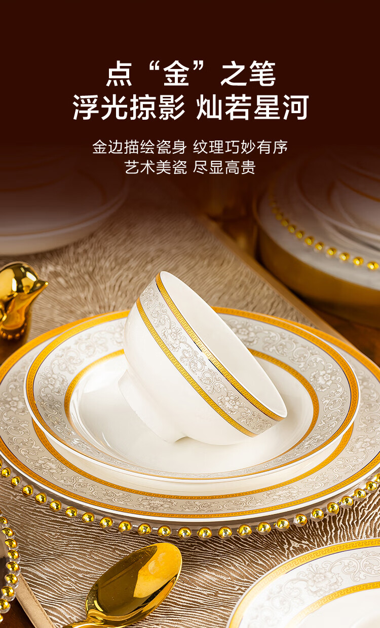 京东京造 碗盘餐具整套 碗具碟子套装乔迁之喜陶瓷礼盒 金玉满堂68头 金缕浮光68头/套