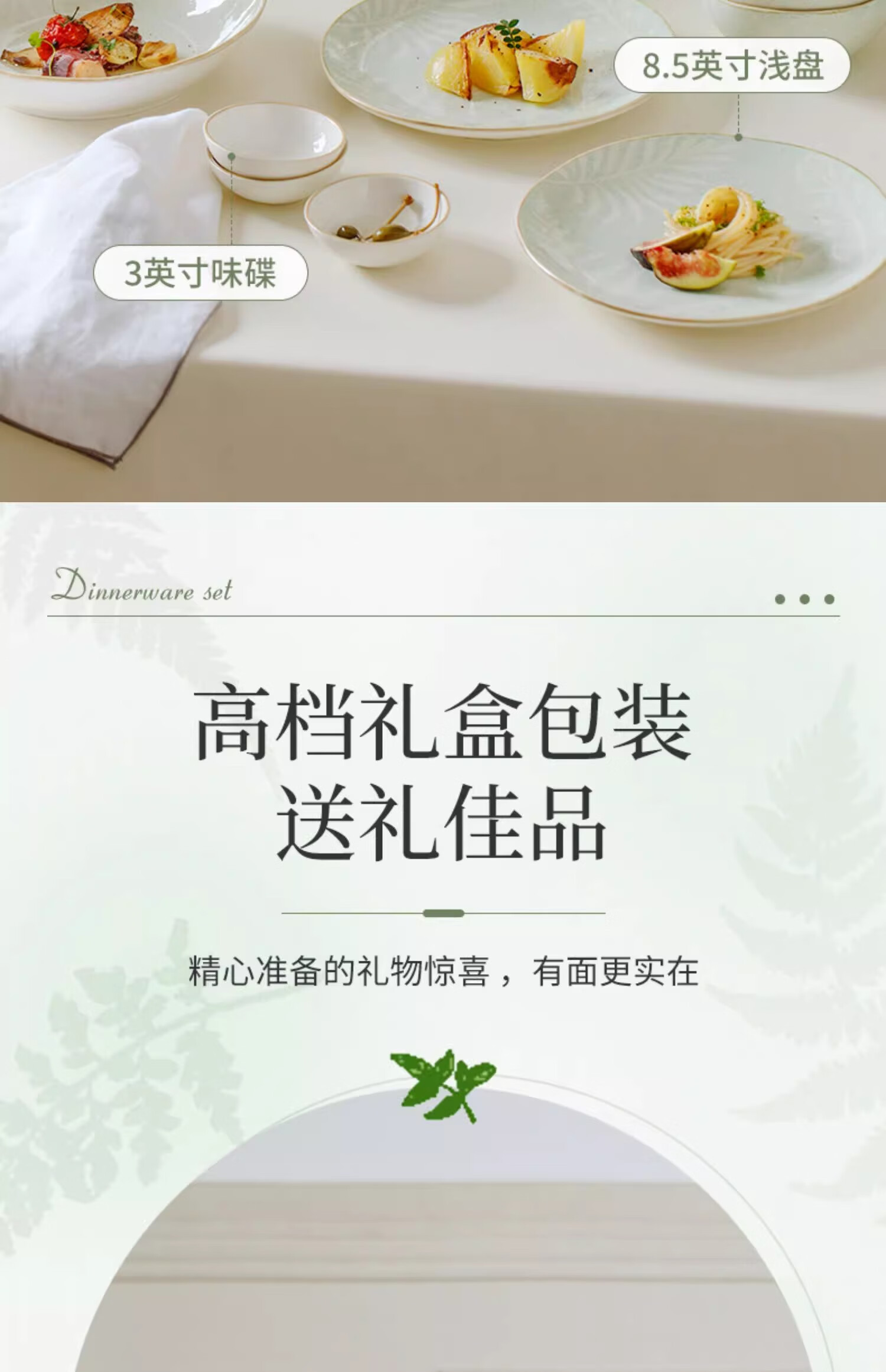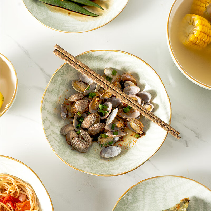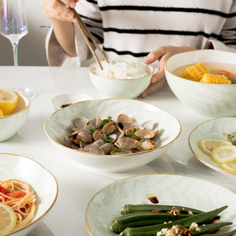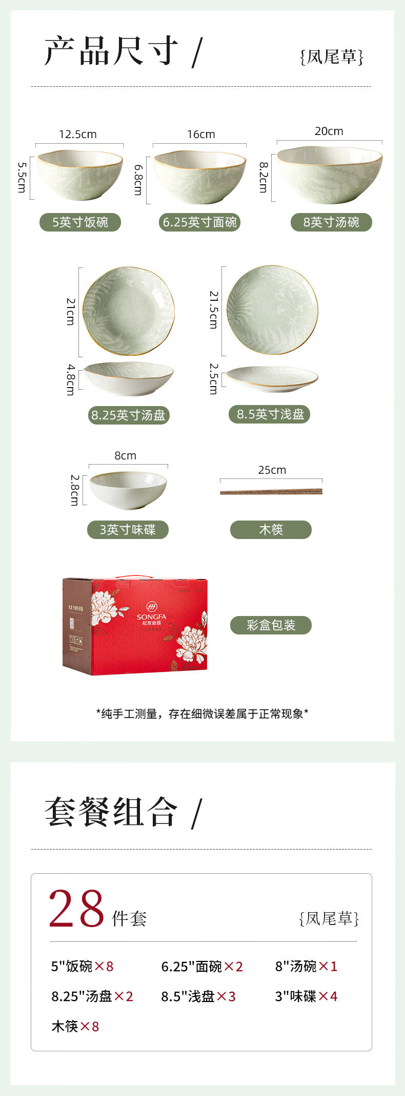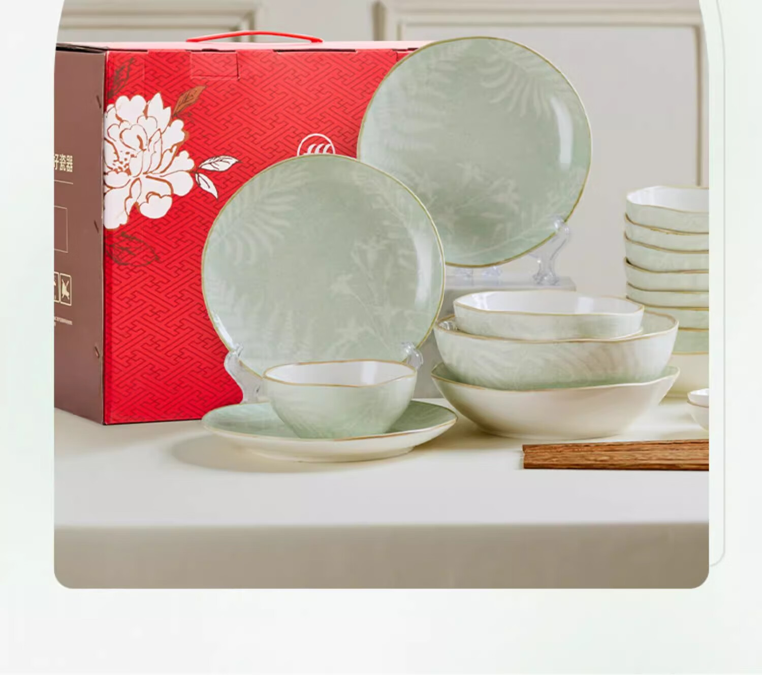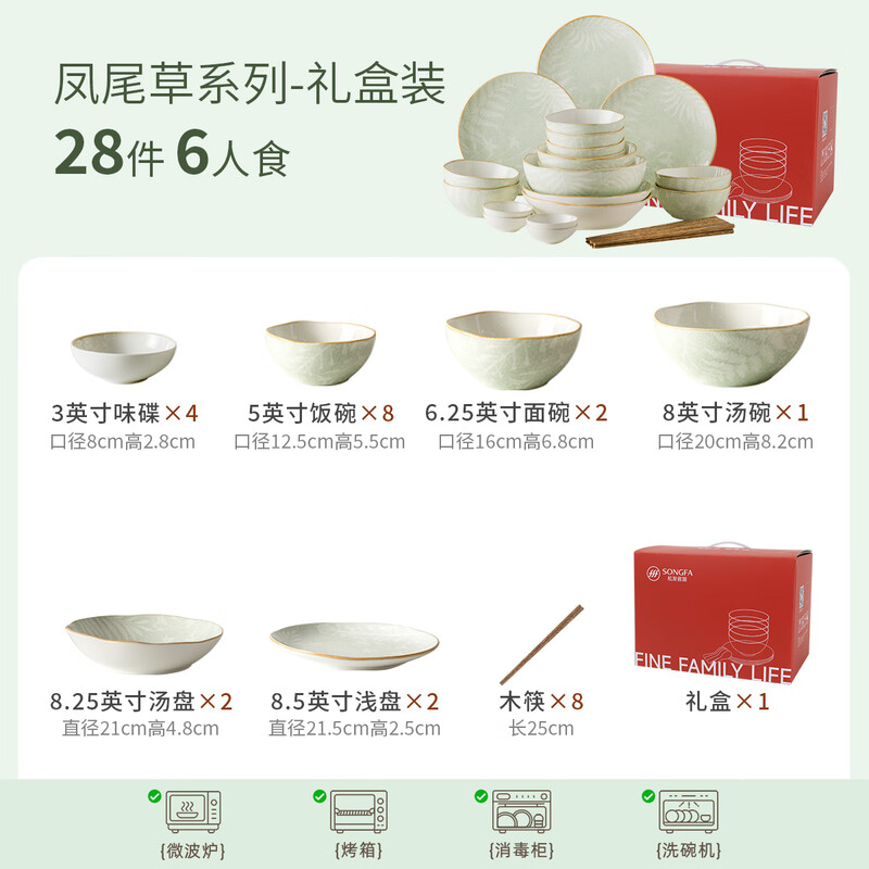 • 商品名称:松发瓷器陶瓷餐具碗碟套装釉下彩整套碗盘筷套装乔迁彩盒28头凤尾草绿 餐具套装/套
