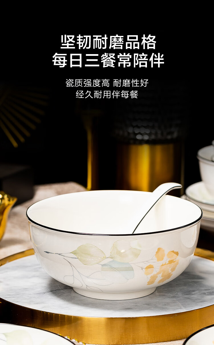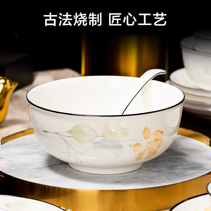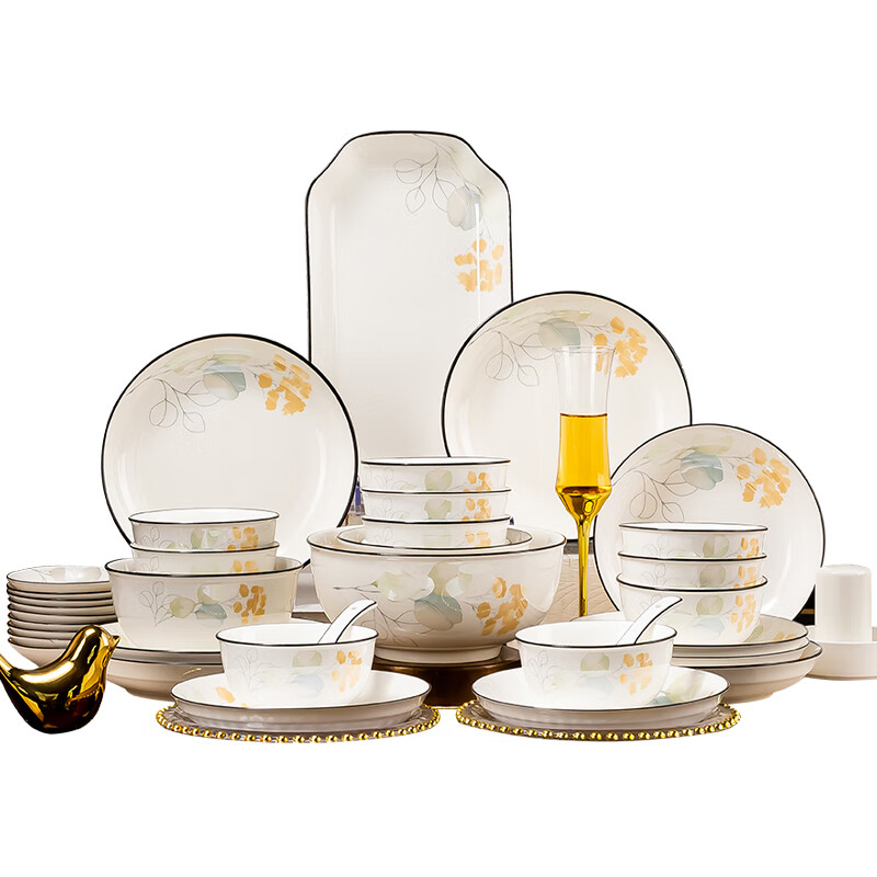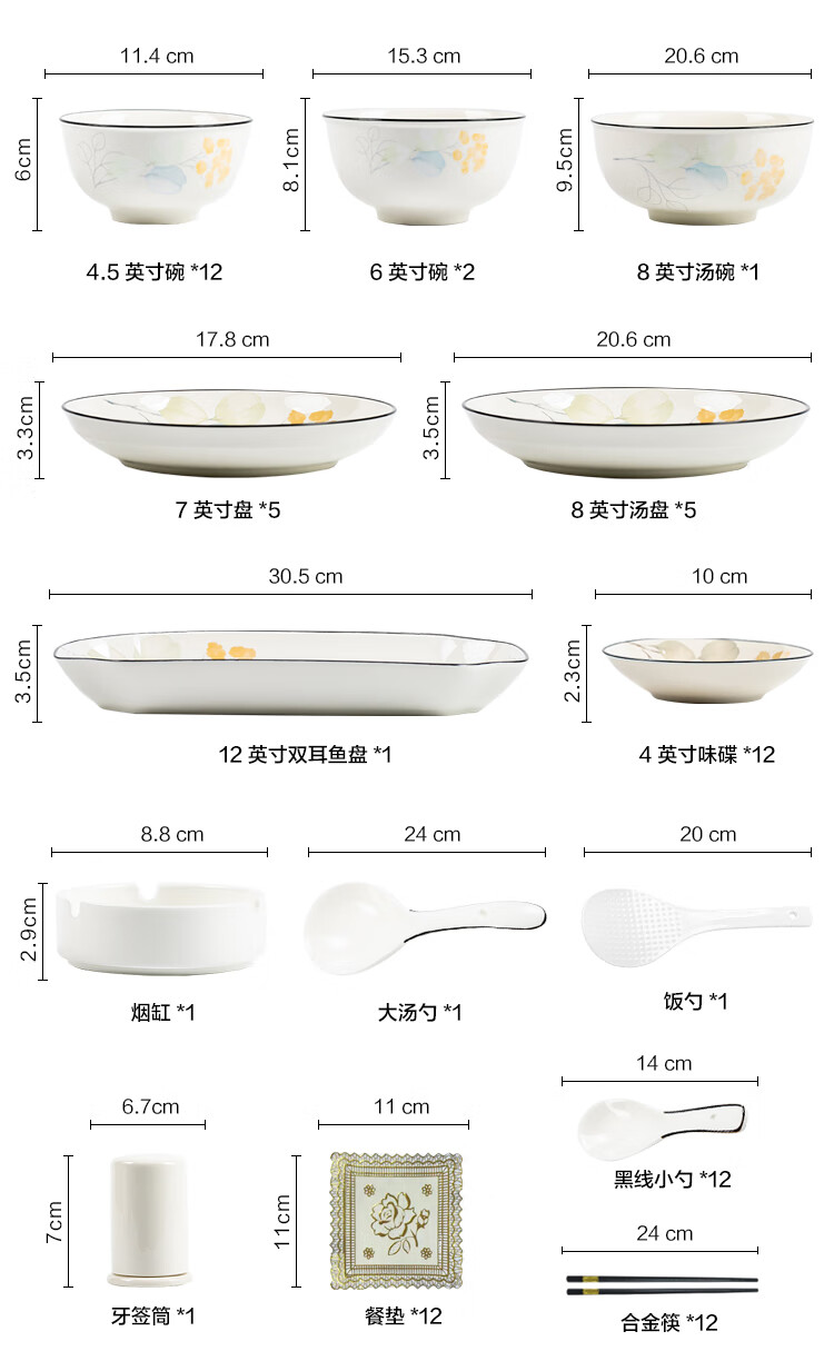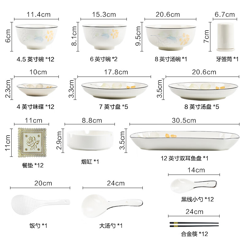 包装清单: 4.5英寸碗*12 6英寸碗*2 8英寸汤碗*1 7英寸盘*5 8英寸汤盘*5 12英寸双耳鱼盘*1 4英寸味碟*12 烟缸*1 大汤勺*1 饭勺*1 牙签筒*1 餐垫*12 黑线小勺*12 合金筷*12