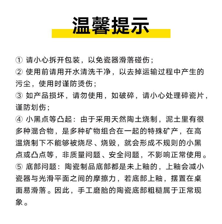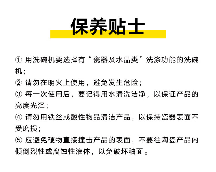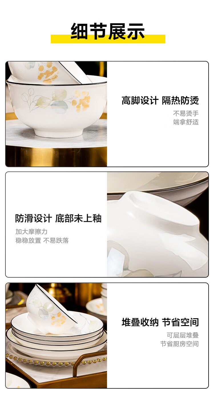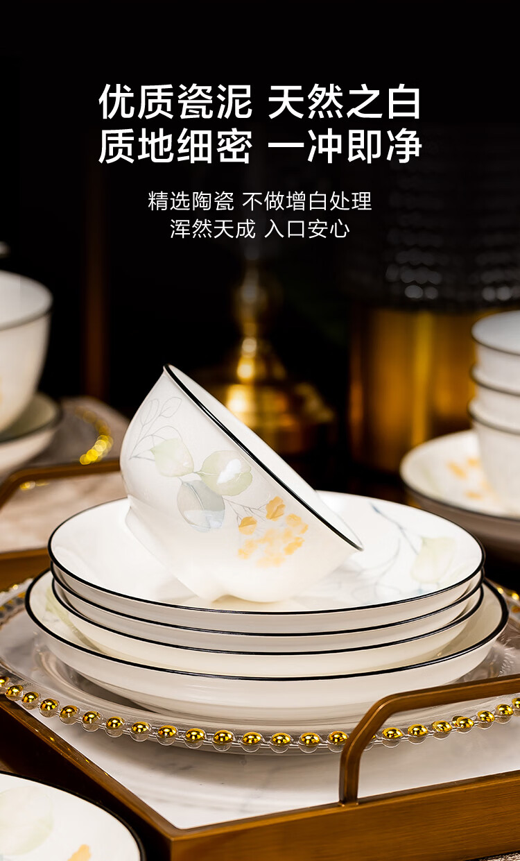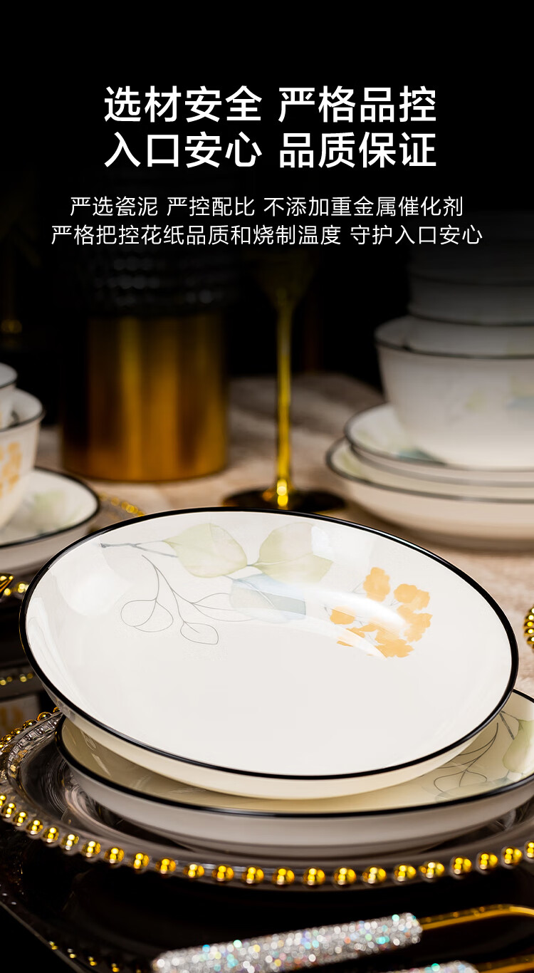 包装清单: 4.5英寸碗*12 6英寸碗*2 8英寸汤碗*1 7英寸盘*5 8英寸汤盘*5 12英寸双耳鱼盘*1 4英寸味碟*12 烟缸*1 大汤勺*1 饭勺*1 牙签筒*1 餐垫*12 黑线小勺*12 合金筷*12