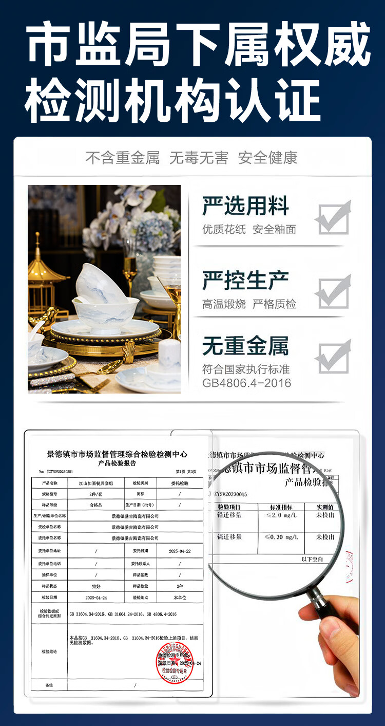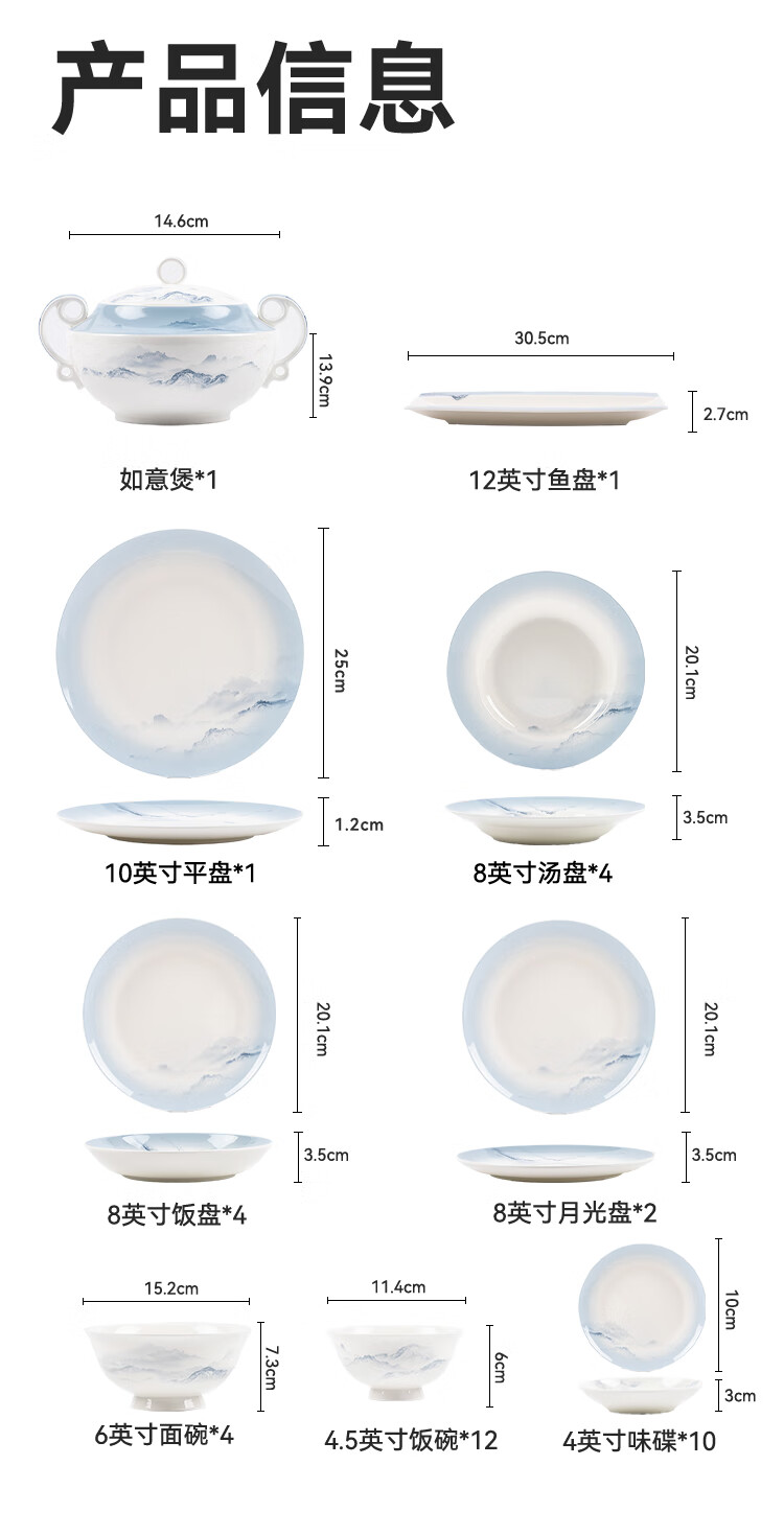 包装清单: 如意煲*1,8英寸饭盘*4,6英寸碗*2,小勺*12,牙签筒*1,餐垫*12,12英寸日式鱼盘*1,8英寸汤盘*4,味碟*12,大勺*1,4.5寸碗*12,8英寸月光盘*2,10英寸盘*1,烟缸*1,合金筷子*12