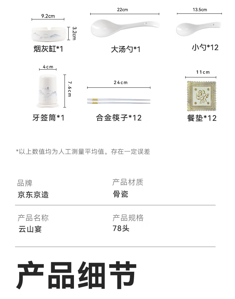 商品名称: 京东京造 碗盘餐具整套 碗具碟子套装骨瓷餐具 礼盒装 78头云山宴餐具套装 JZ-3684/套