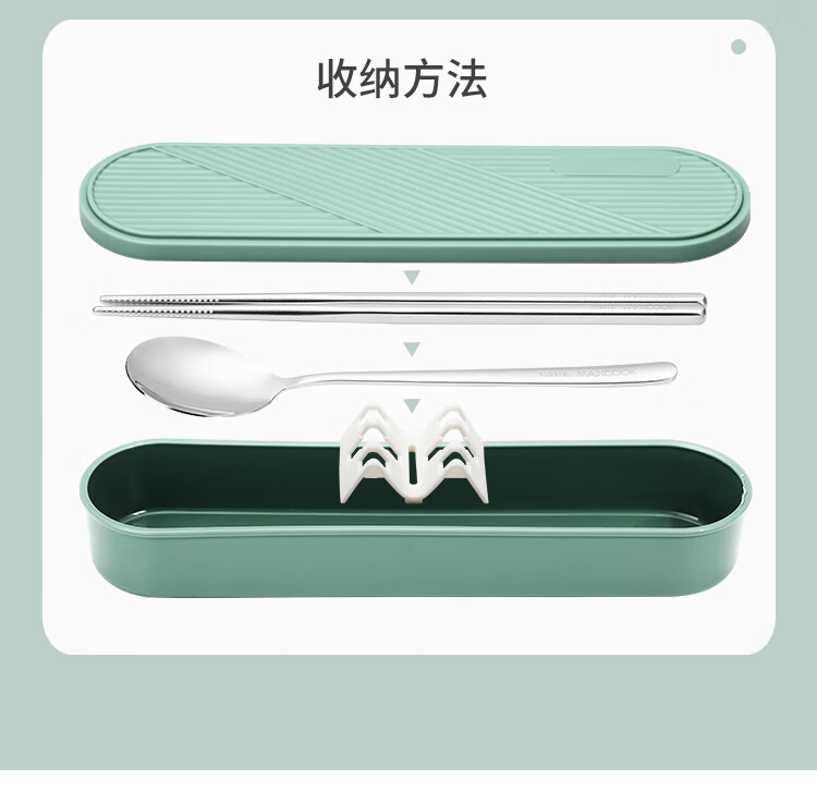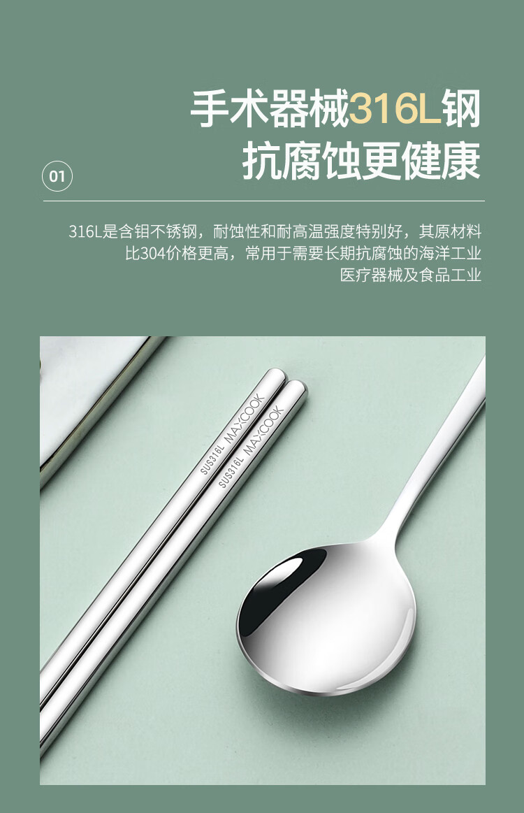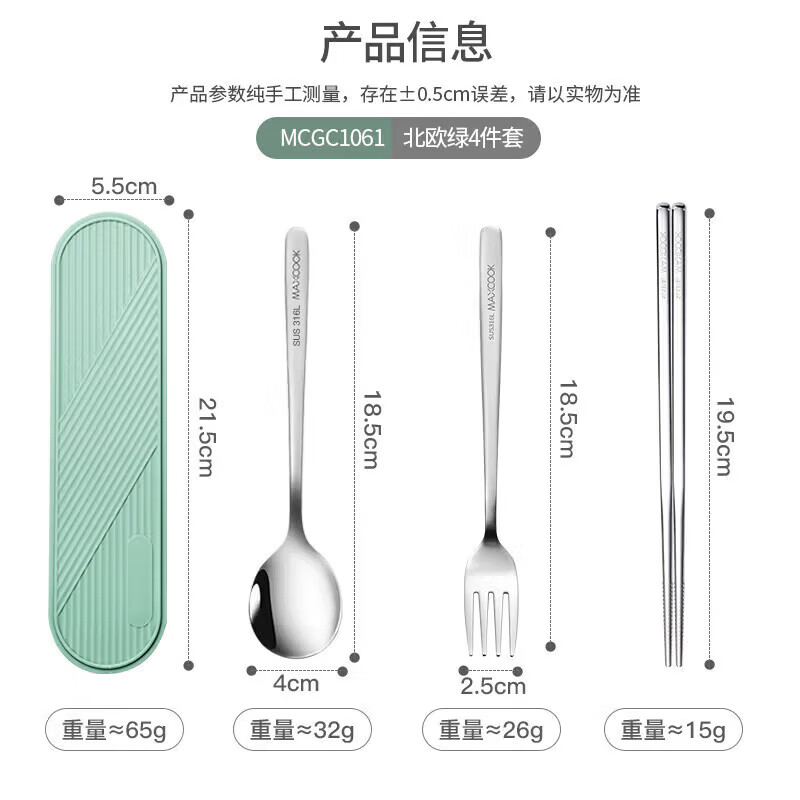 • 商品名称:美厨(maxcook)316L不锈钢筷子勺子叉子餐具套装 便携式筷勺四件套 绿MCGC1061 316L不锈钢筷勺叉套装/个
