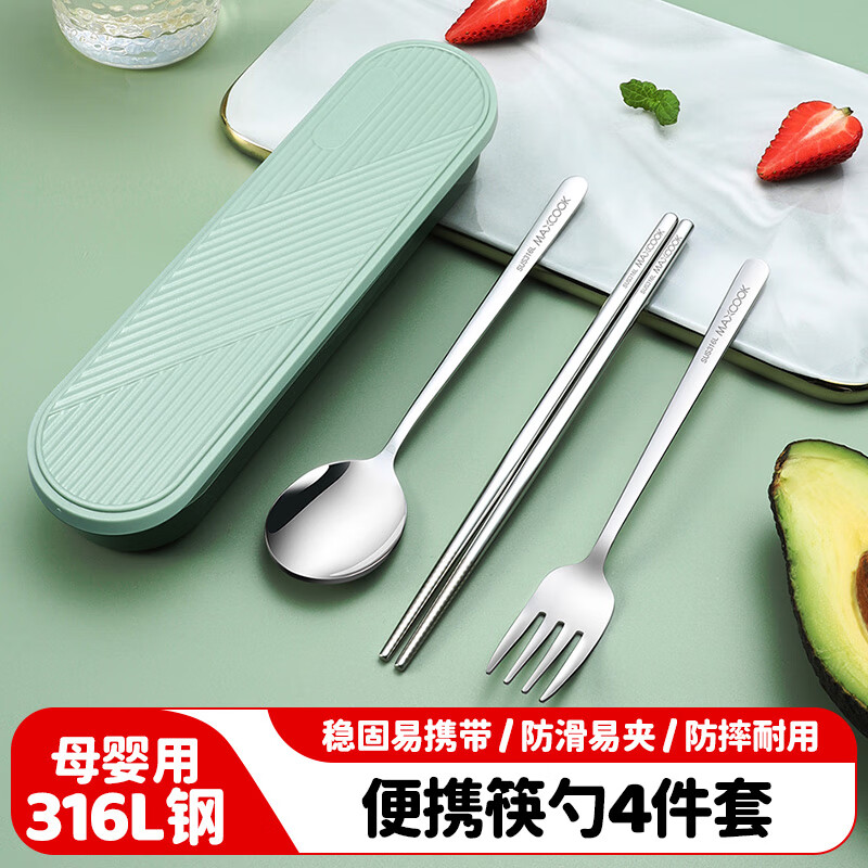 美厨(maxcook)316L不锈钢筷子勺子叉子餐具套装 便携式筷勺四件套 绿MCGC1061 316L不锈钢筷勺叉套装/个