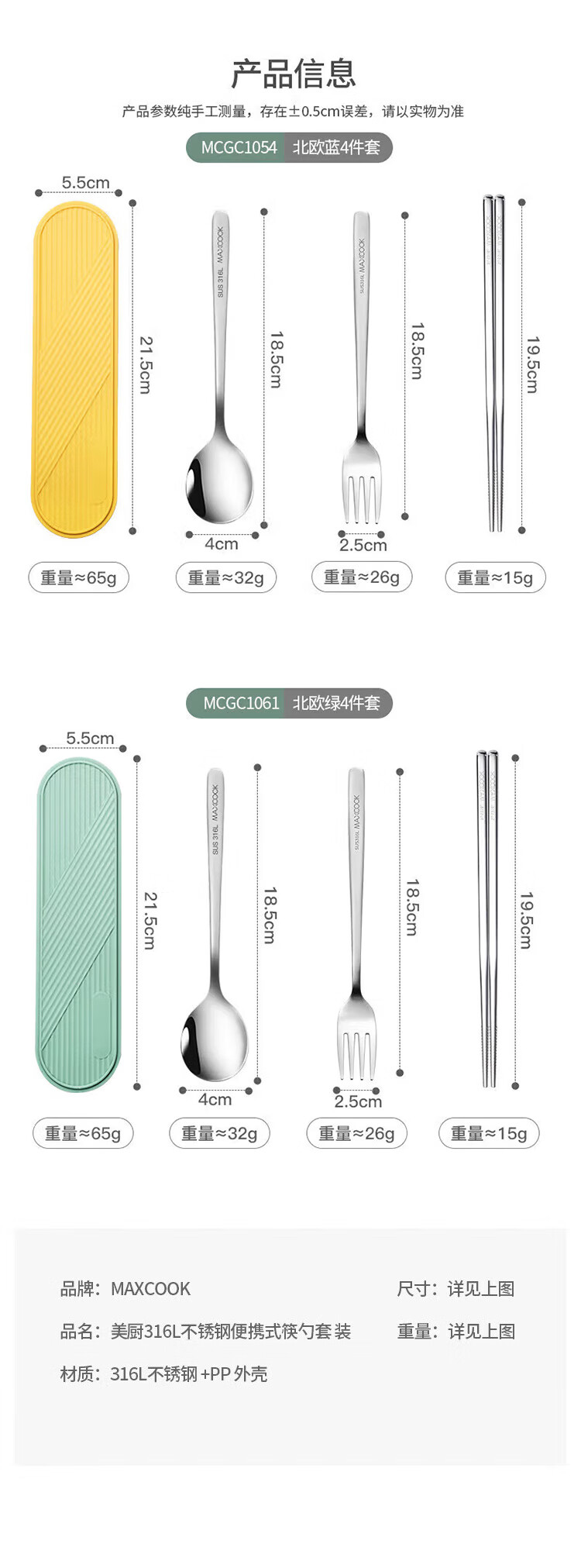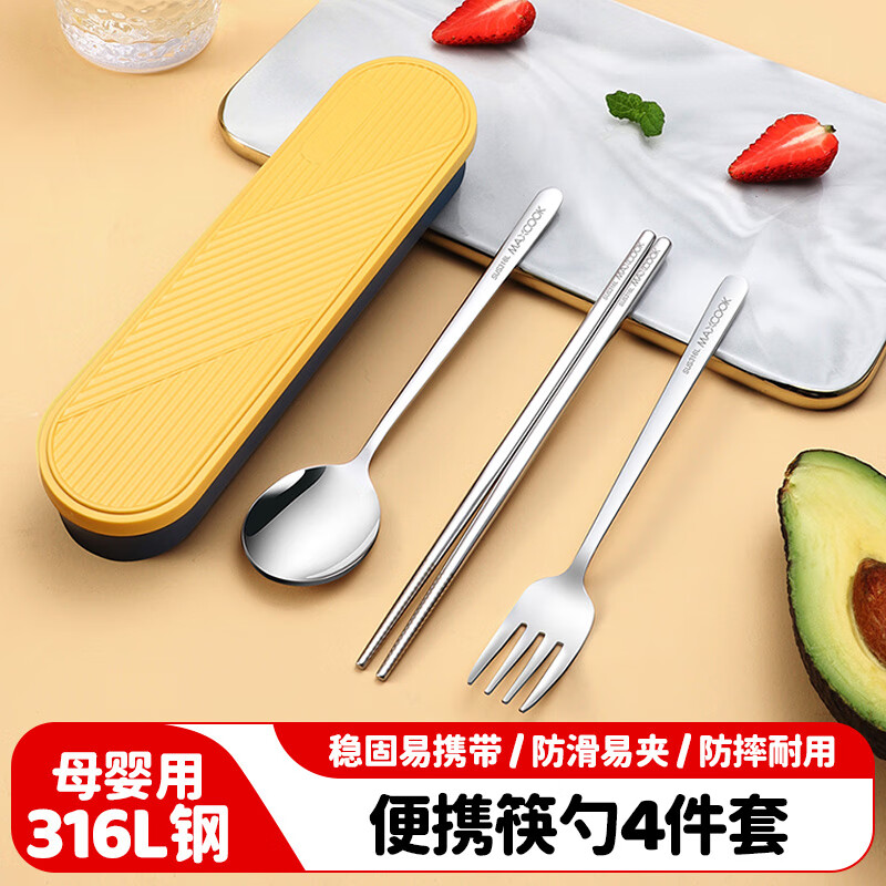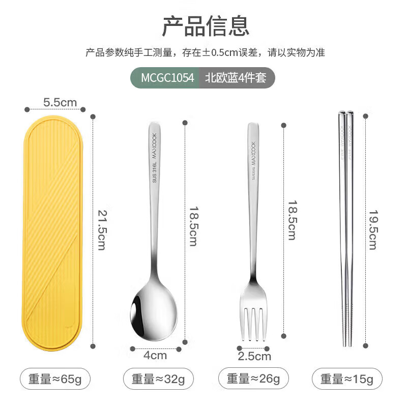 • 商品名称:美厨(maxcook)316L不锈钢筷子勺子叉子餐具套装 便携式筷勺四件套 蓝MCGC1054 316L不锈钢筷勺叉套装/个