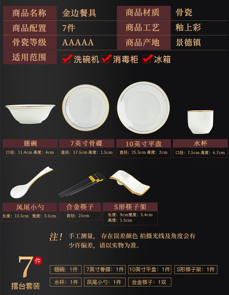 包装清单: 7寸骨碟*1、4英寸翅碗*1、江中杯*1、凤尾小勺*1