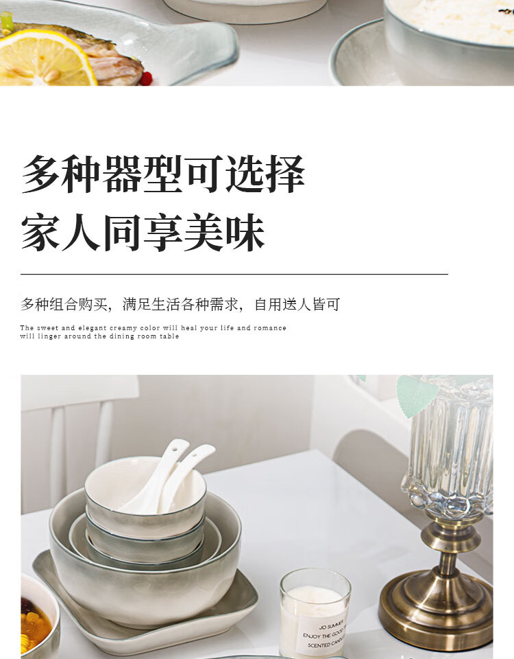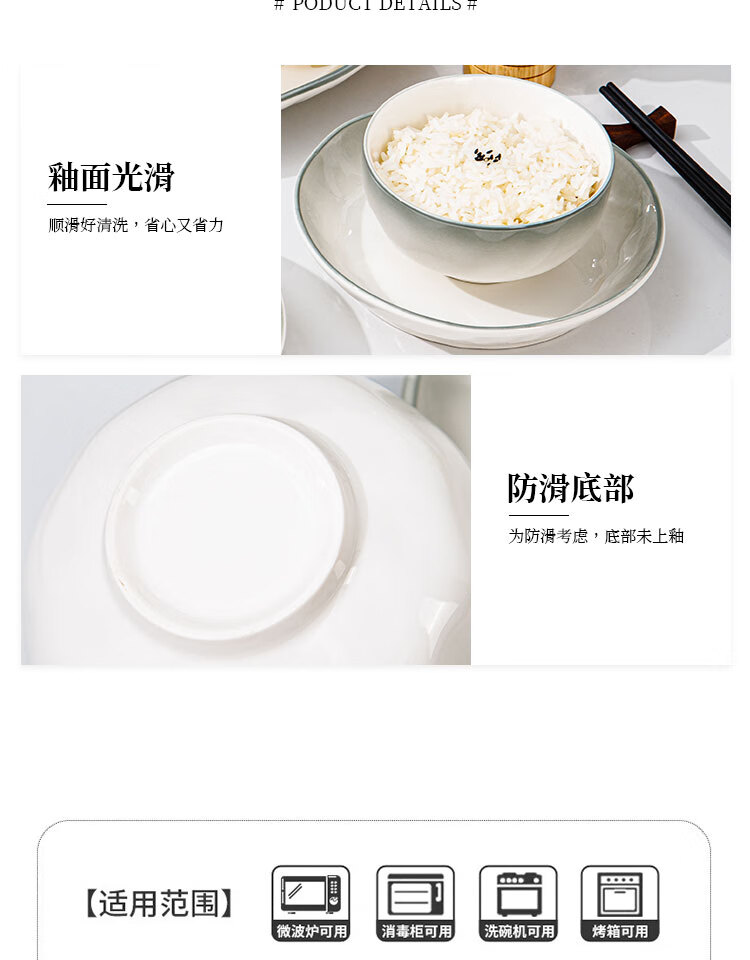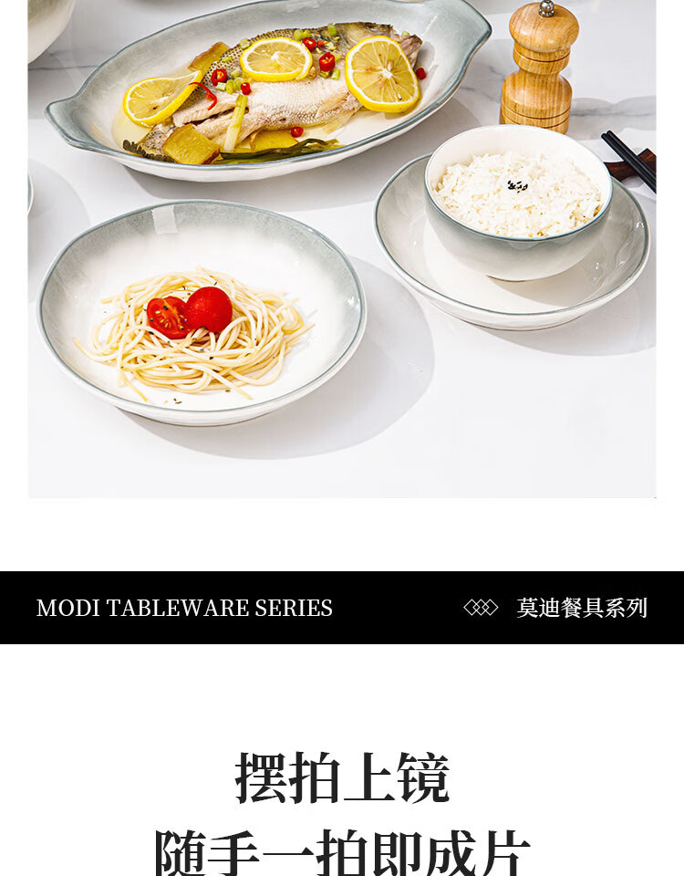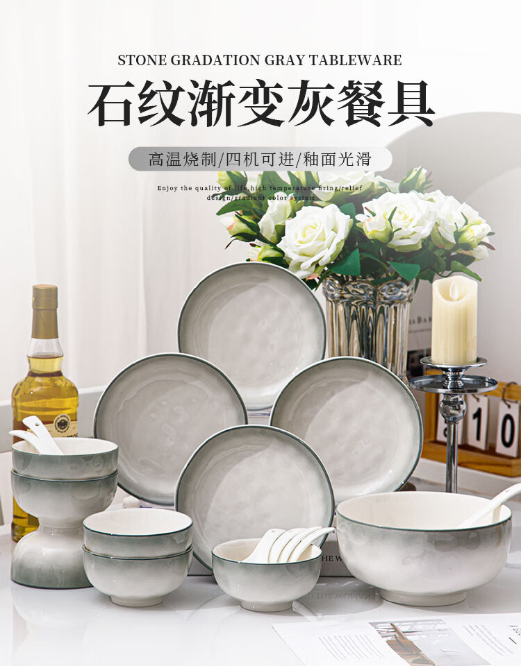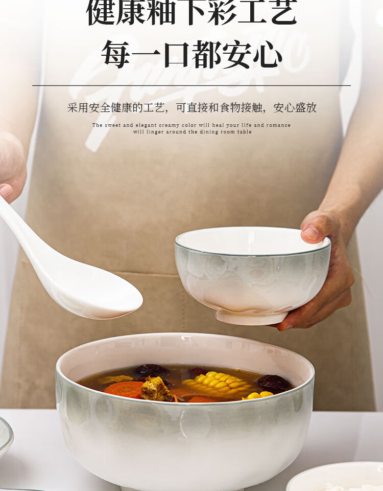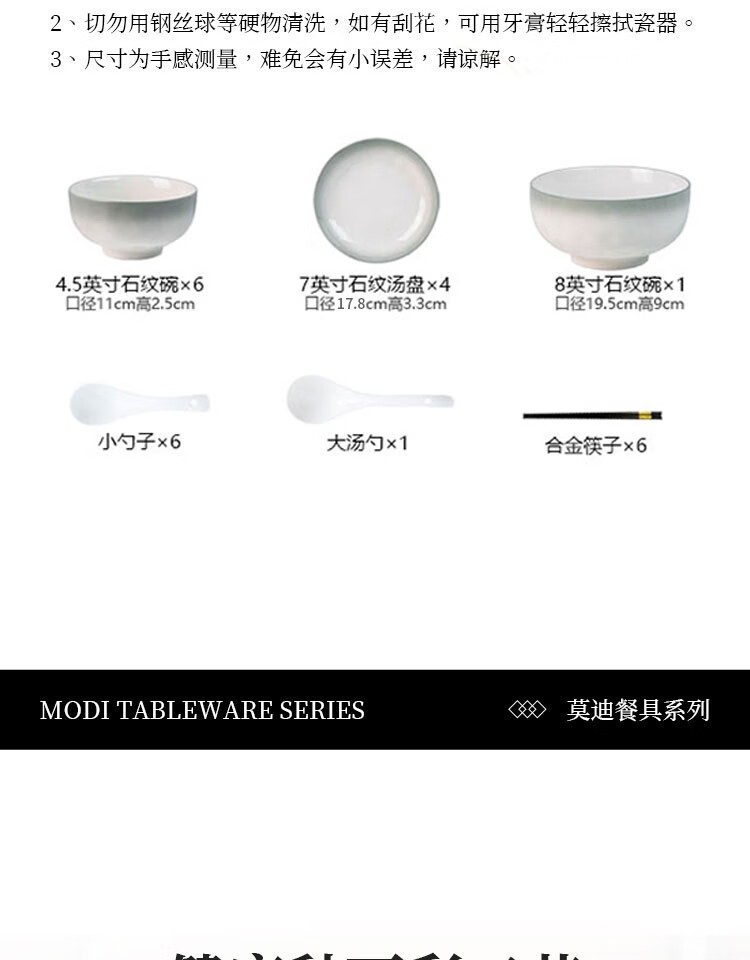 包装清单: 7寸石纹汤盘/莫迪*4、4.5寸石纹碗/莫迪*6、8寸石纹碗/莫迪*1、5寸小汤勺*6、大汤勺*1、合金筷子*6