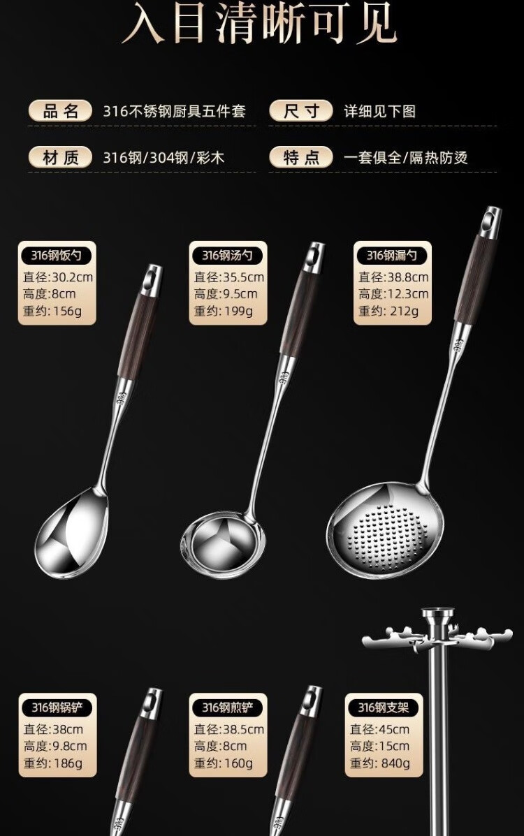 商品名称: HUIHUADU316不锈钢锅铲套装黑檀木【锅铲+汤勺+漏勺】 锅铲套装/套