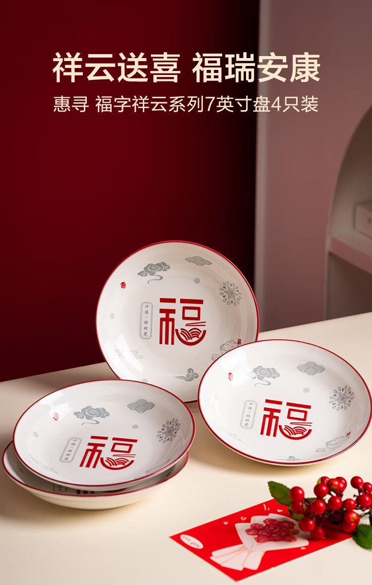 惠寻京东自有品牌 釉下彩中式福字祥云家用碗碟套装7英寸盘子4只装 福字祥云/套