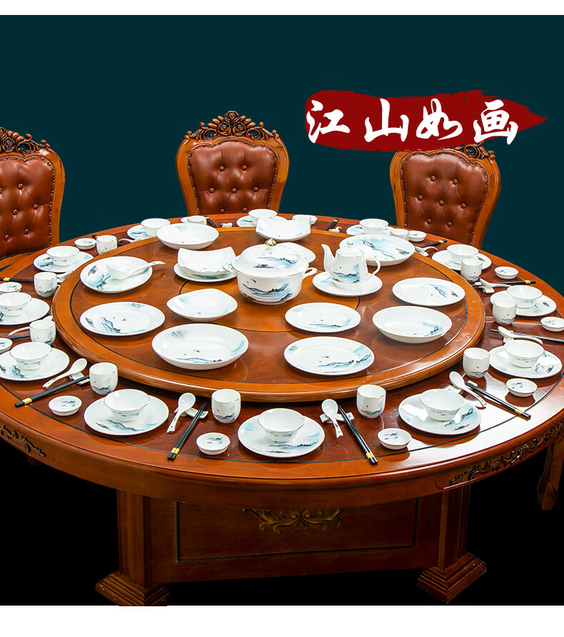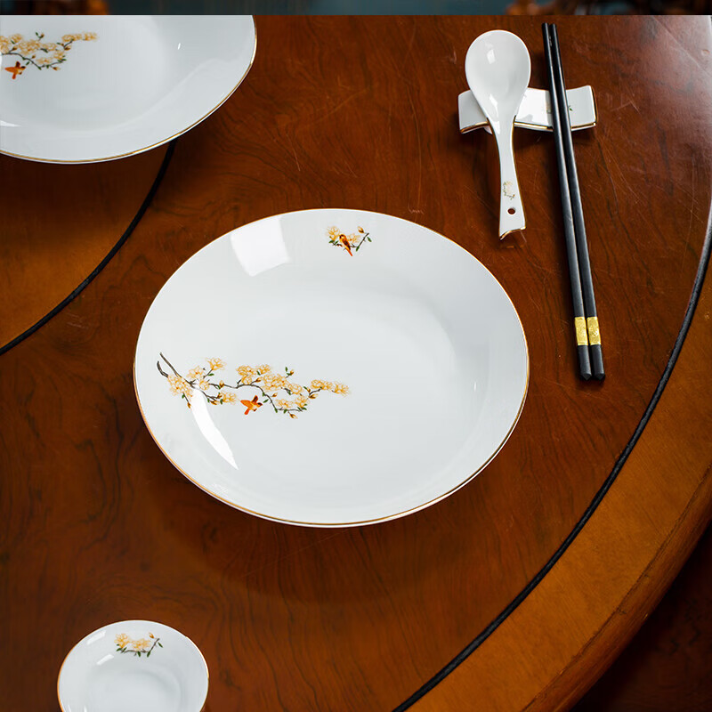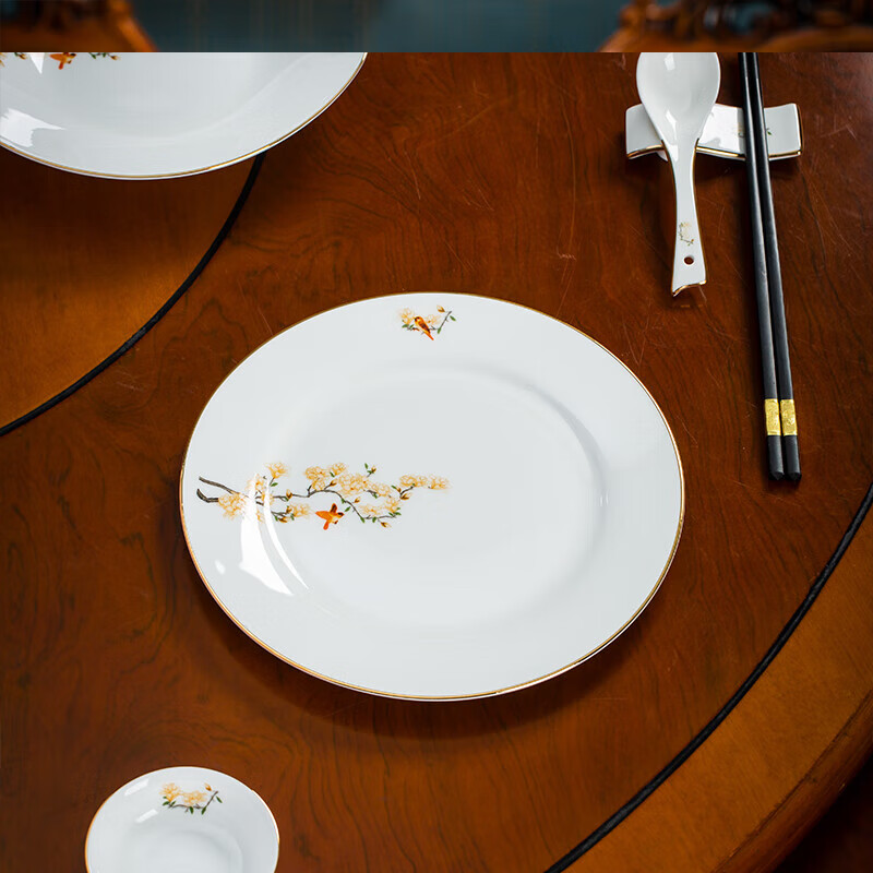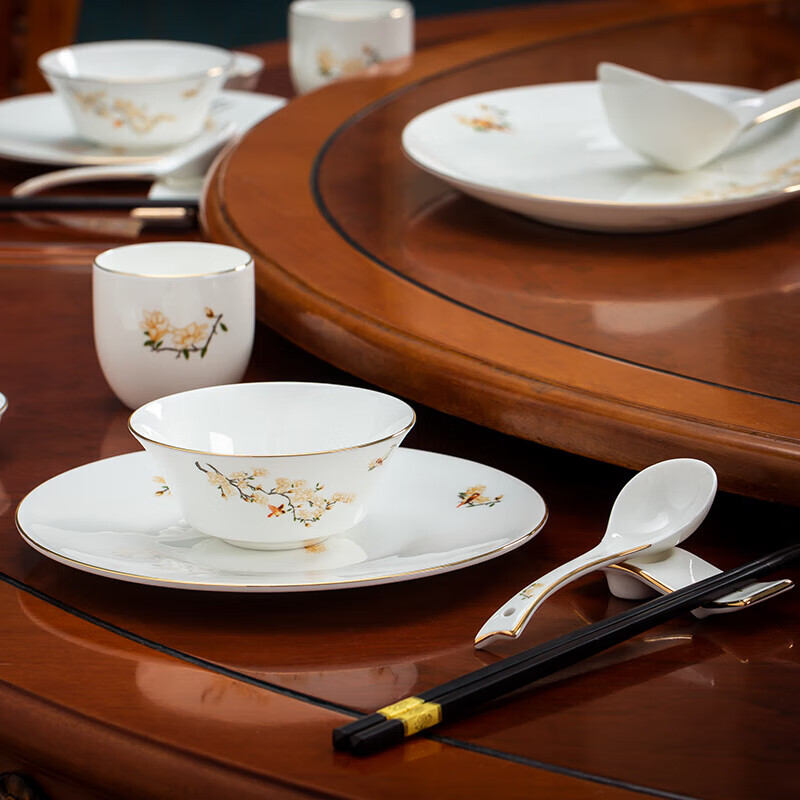 • 商品名称:陶相惠餐具套装商用圆桌餐具12人位骨瓷中国风碗碟套装酒店摆台餐具套装 金边玉兰12人位国标豪华套装/套