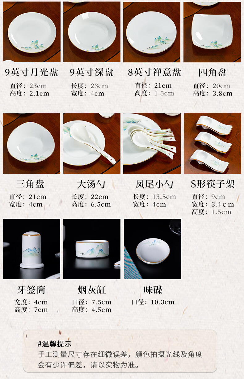 包装清单: 4英寸米奇碗*12、s型筷子架*12、8英寸禅意盘*12、味碟*12、凤尾小勺*12、江中杯*12、合金筷子*12、大明珠煲*1、茶壶*1、大汤勺*1、烟灰缸*2、牙签筒*2、12英寸月光鱼盘*1、10英寸平盘*2、10.5英寸深菜盘*2、9英寸平盘*2、9英寸月光盘*2、9英寸深盘*2、三角盘*2、四角盘*2