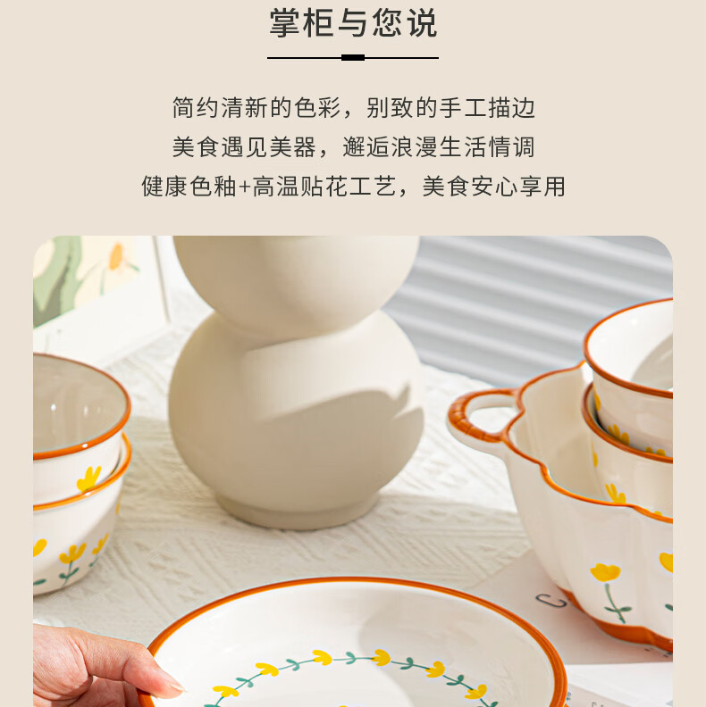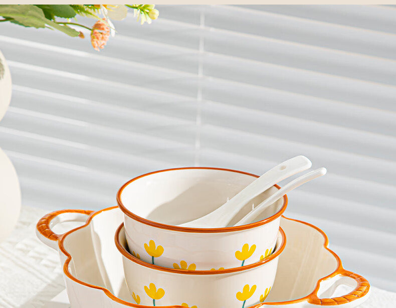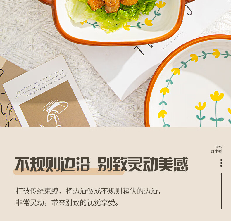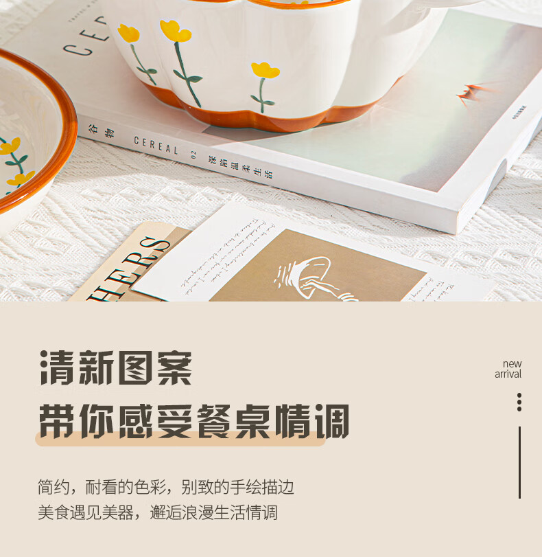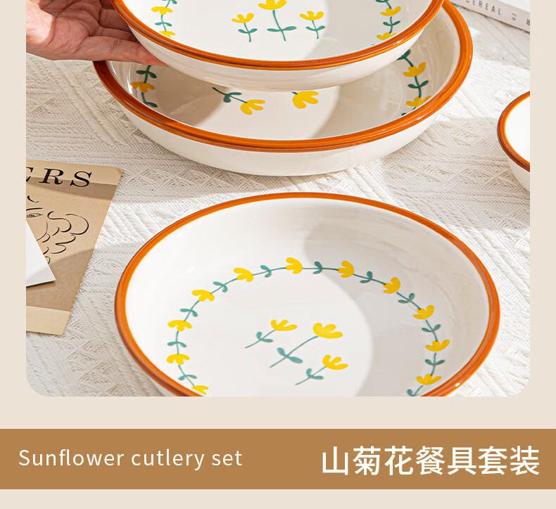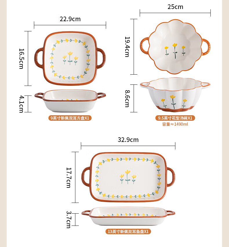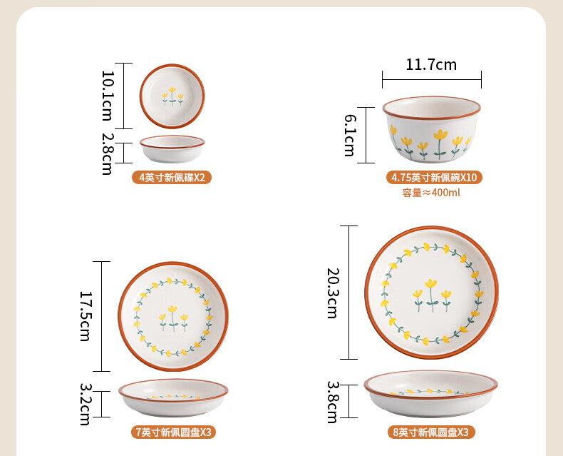 包装清单: 9.5英寸双耳花型汤碗1 合金筷子10 大白勺1 小白勺10 4.75英寸新佩碗/山菊花10 4英寸新佩碟/山菊花2 7英寸新佩盘/山菊花3 8英寸新佩盘/山菊花3 9寸新佩双耳方盘/山菊花1 13英寸新佩双耳鱼盘/山菊花1