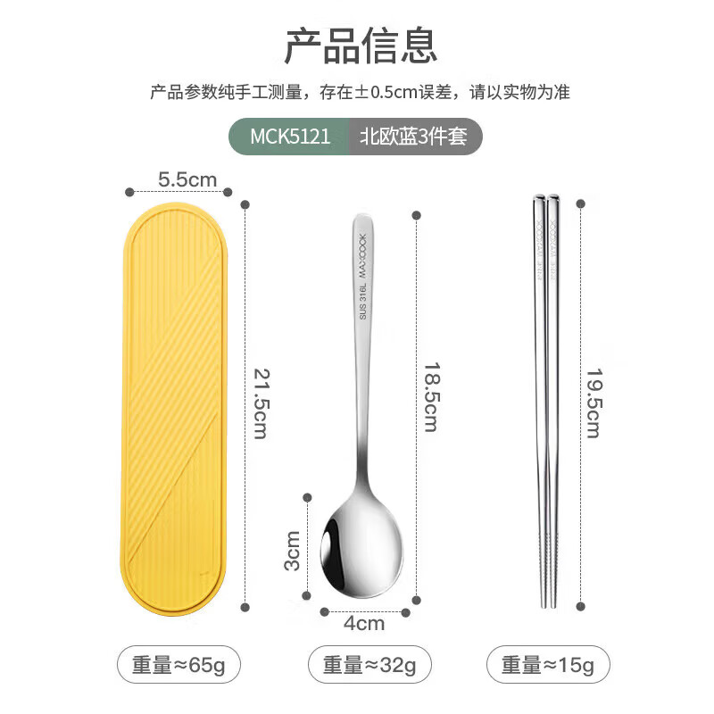 商品名称: 美厨(maxcook)316L不锈钢筷子勺子餐具套装 便携式筷勺三件套 北欧蓝 MCK5121 316L不锈钢筷勺/个