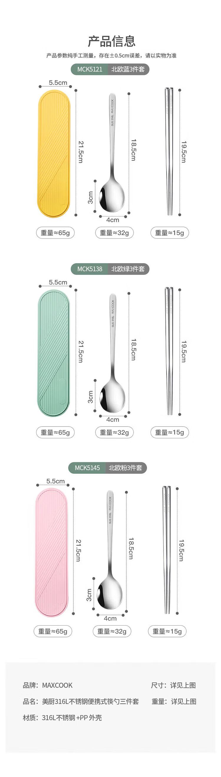 • 商品名称:美厨(maxcook)316L不锈钢筷子勺子餐具套装 便携式筷勺三件套 北欧蓝 MCK5121 316L不锈钢筷勺/个