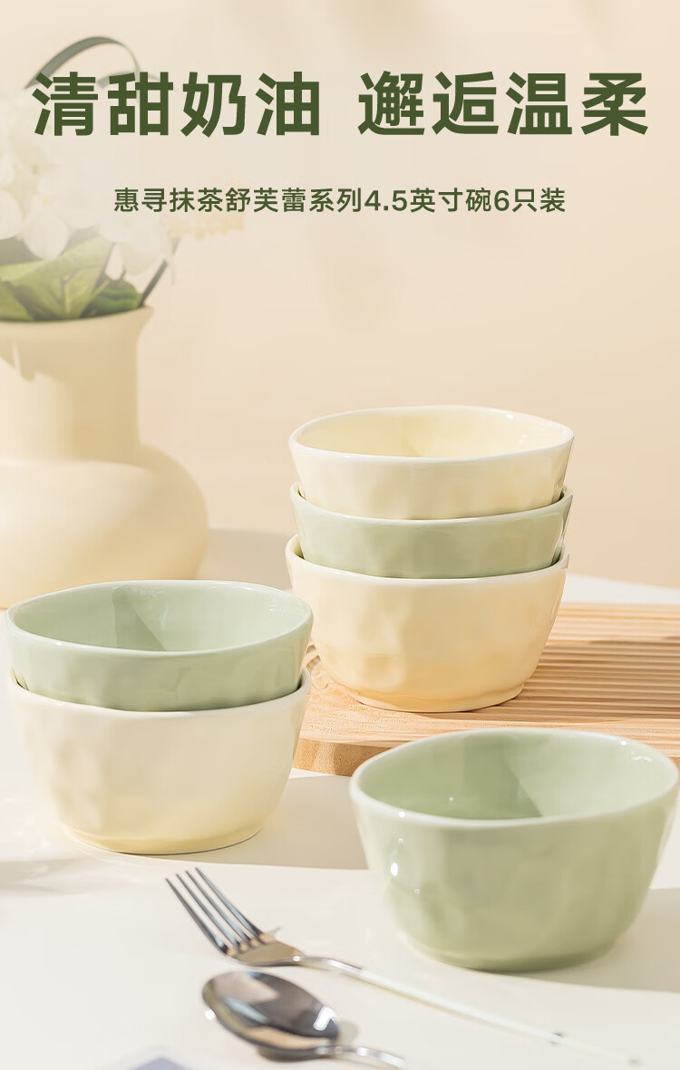 惠寻 碗 家用陶瓷碗碟套装抹茶舒芙蕾双色米饭碗 4.5英寸6只装 抹茶舒芙蕾/套
